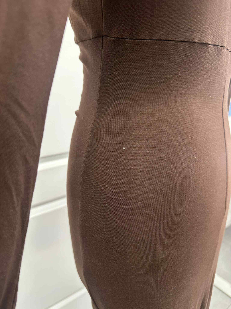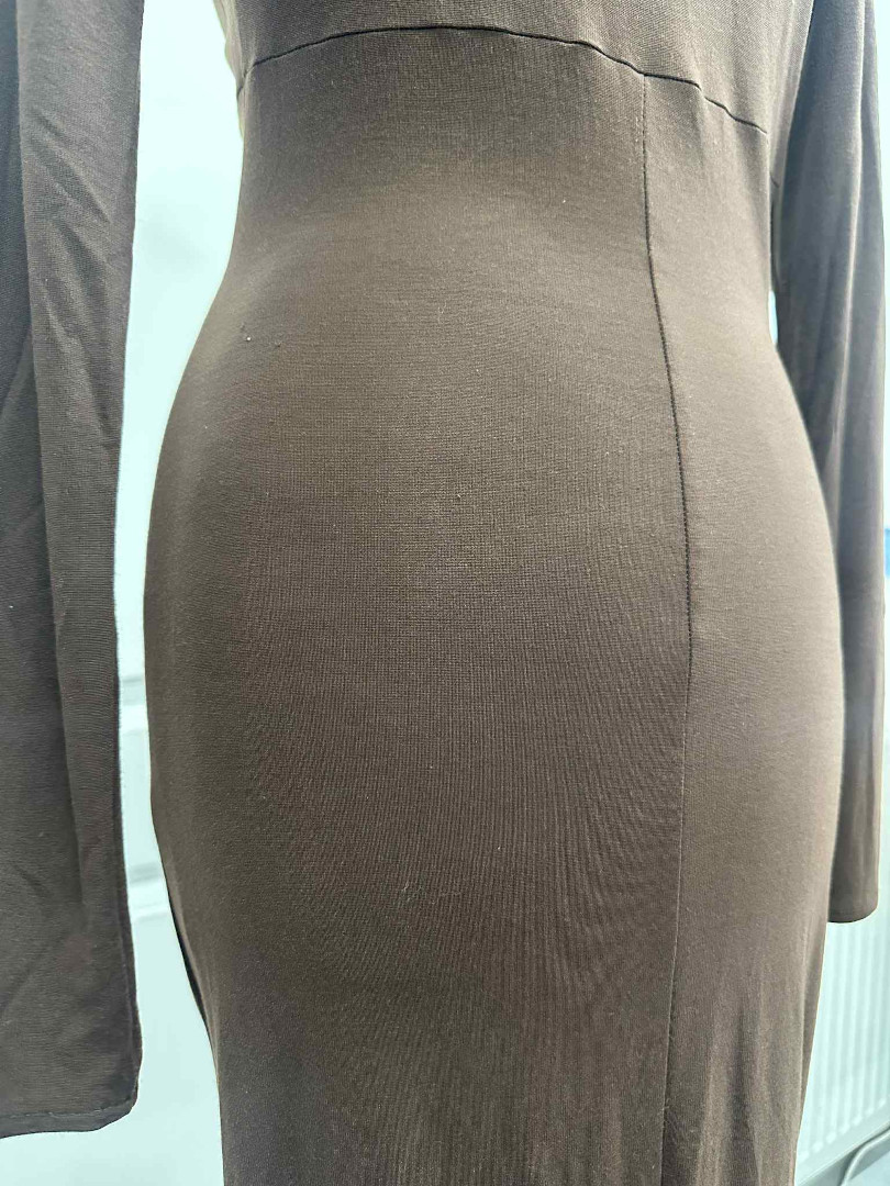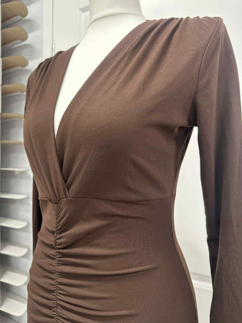 Lianna A280 - chocolate fitted long sleeve dress with padded shoulders
