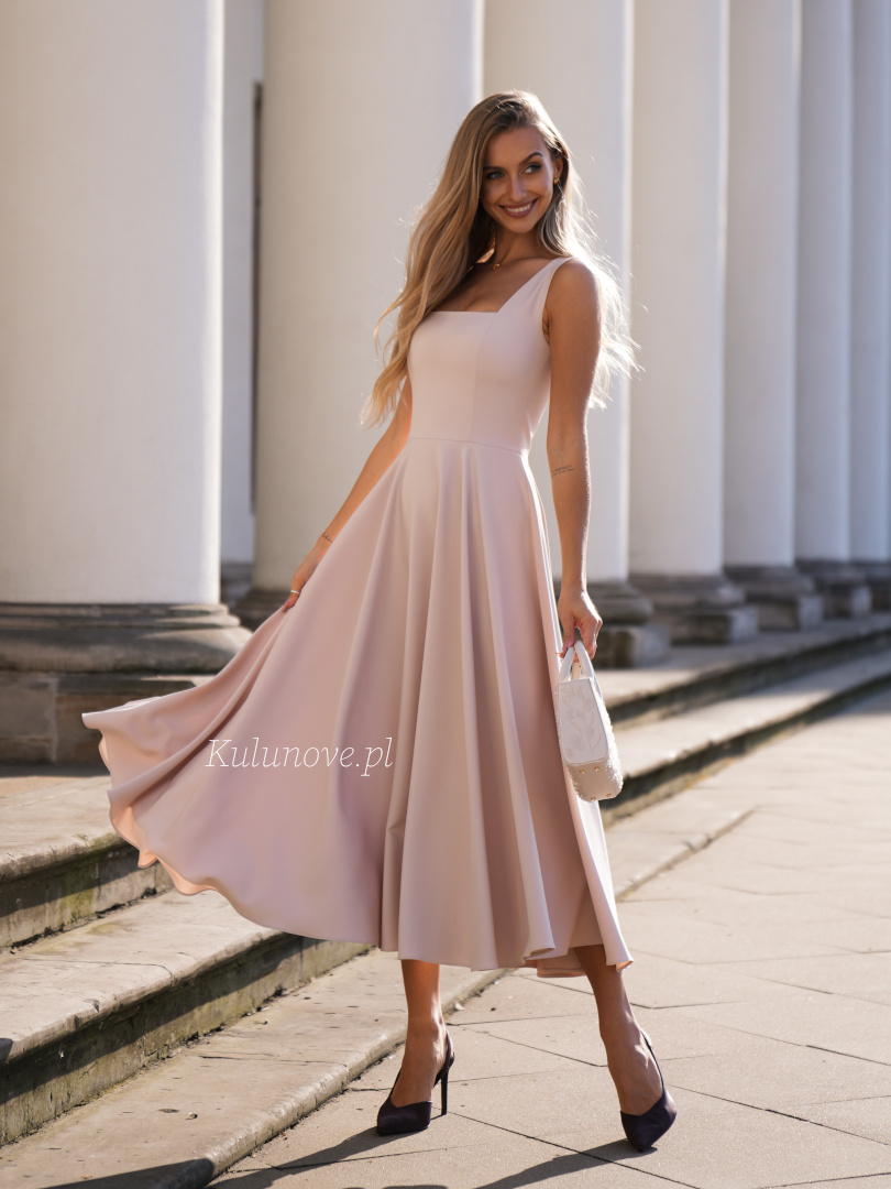 Karlie midi - beige midi dress with flared bottom wide straps and classic karo neckline
