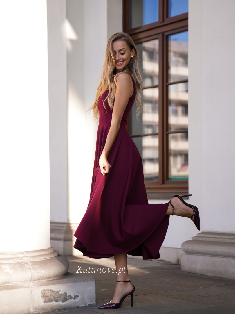 Karlie midi - burgundy dress with fitted strapless top and flared midi length bottom.