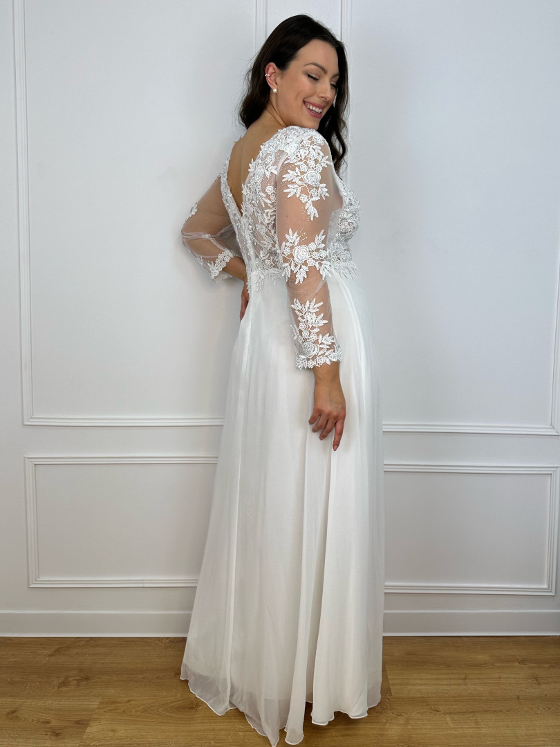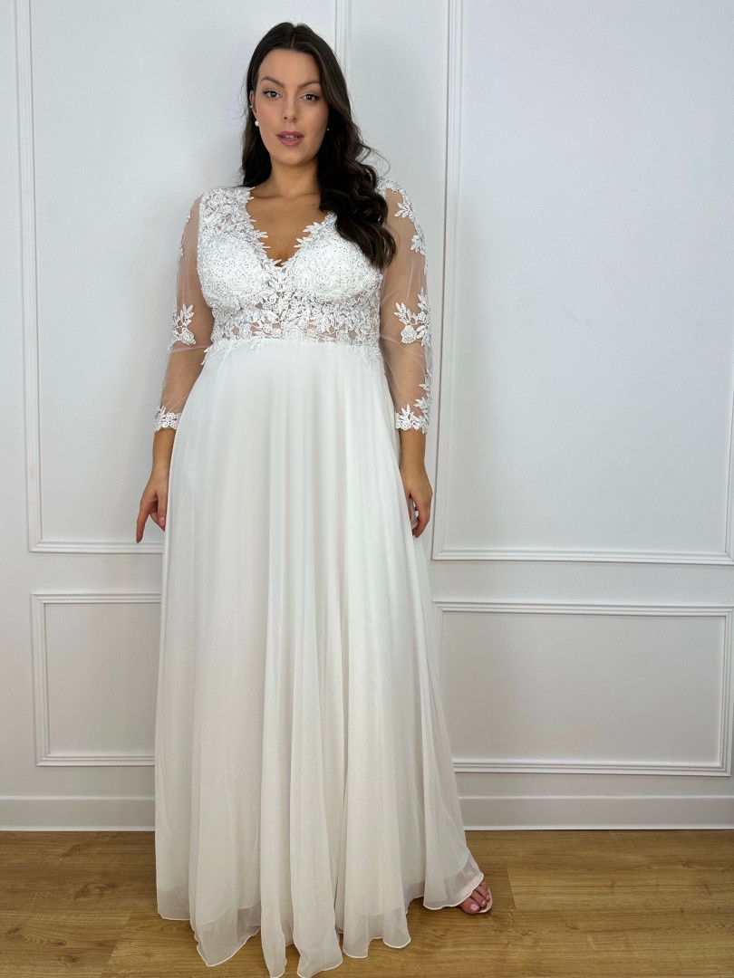Airy plus size wedding dress with delicate tulle sleeves embroidered with lace.