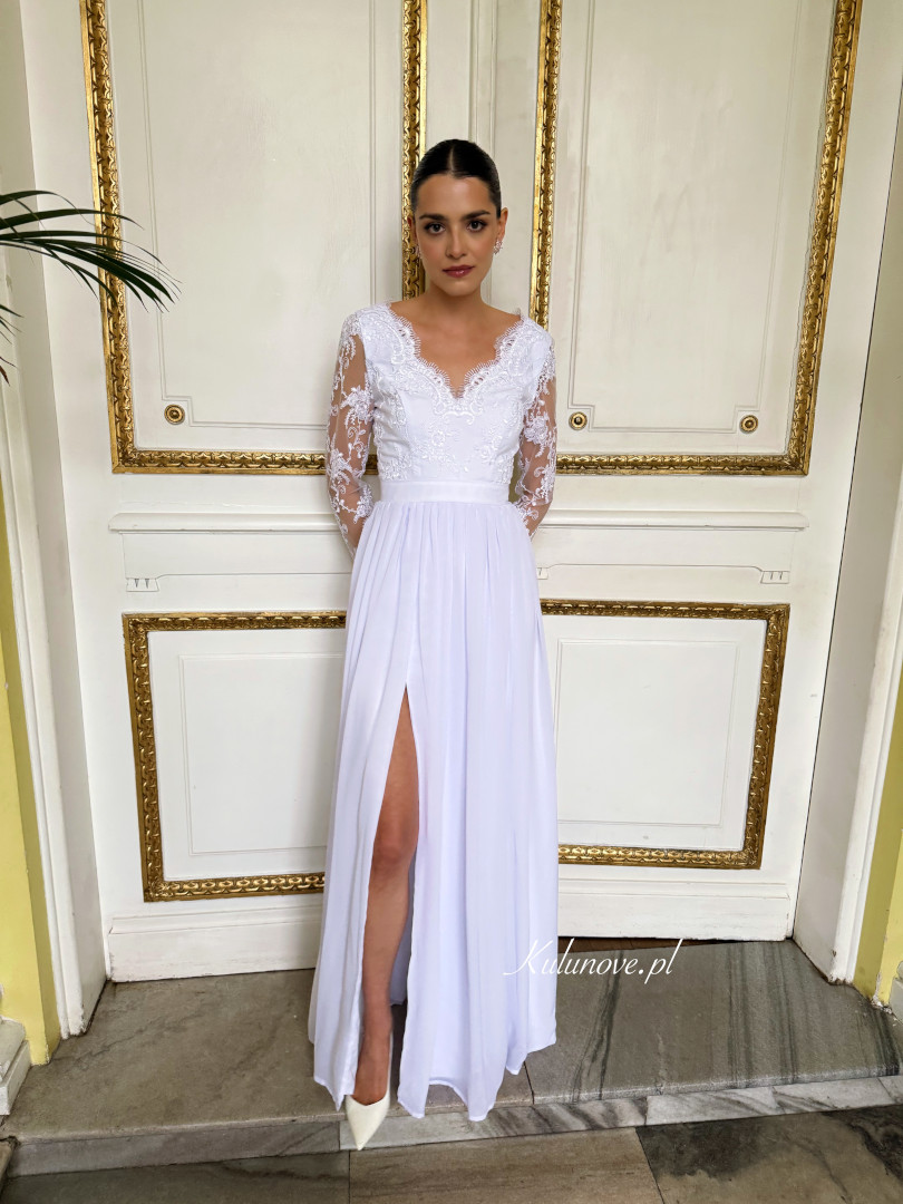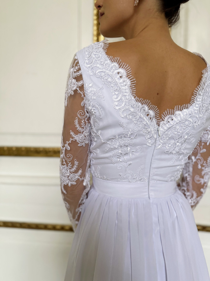 Subtle and elegant maxi wedding dress in snow-white color.
