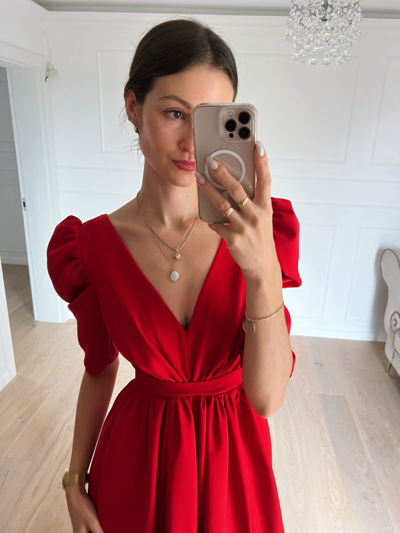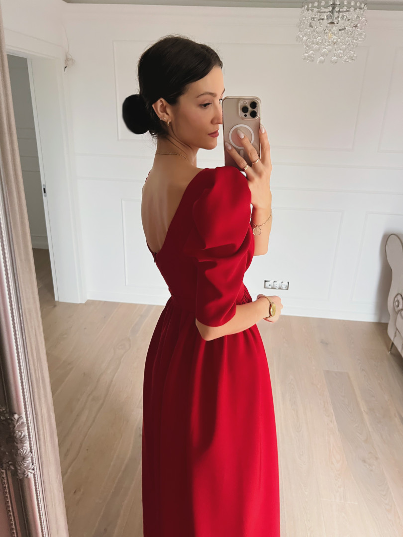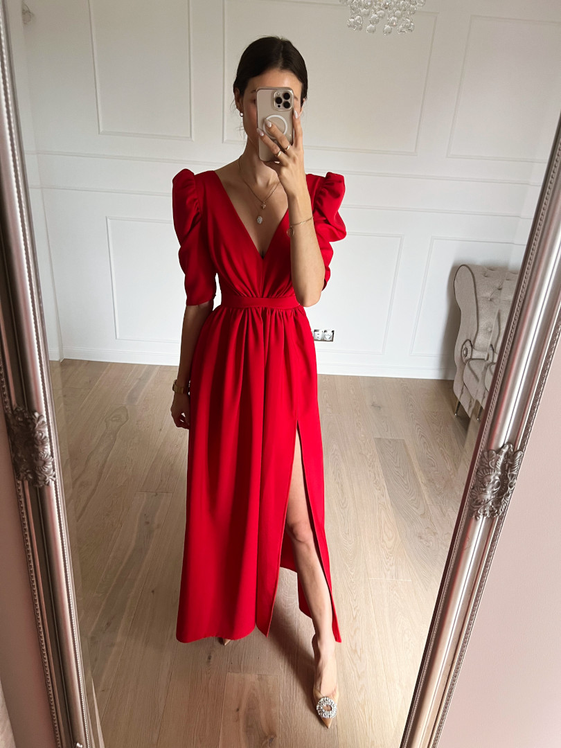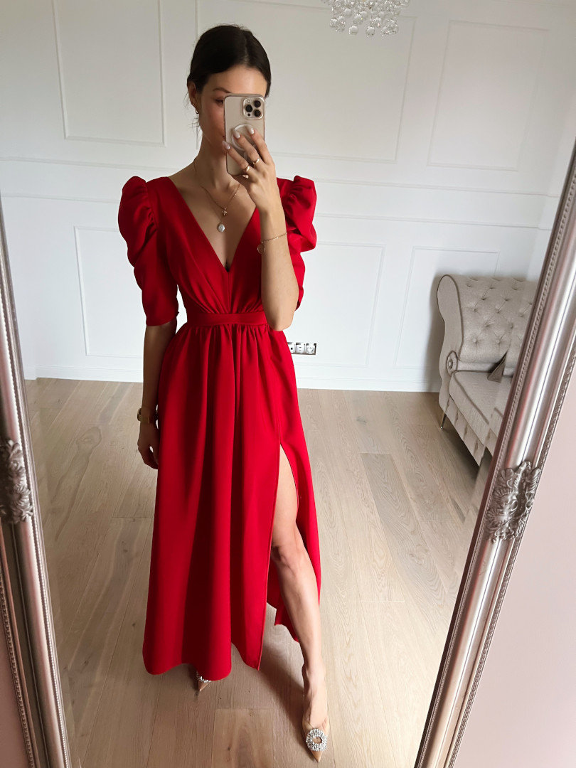 The dress has a delicate leg slit and 3/4 sleeves with buffets.