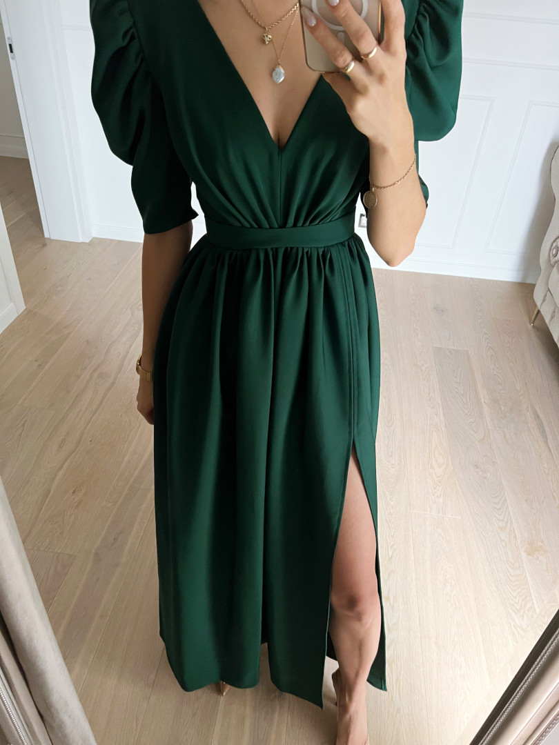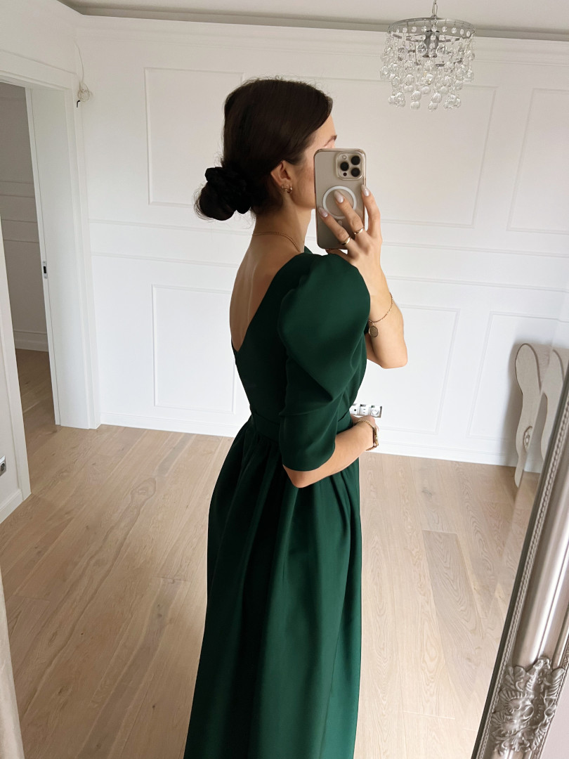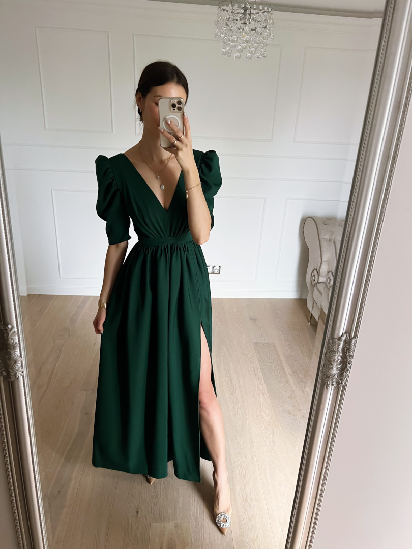 Bottle green dress with a deep neckline.