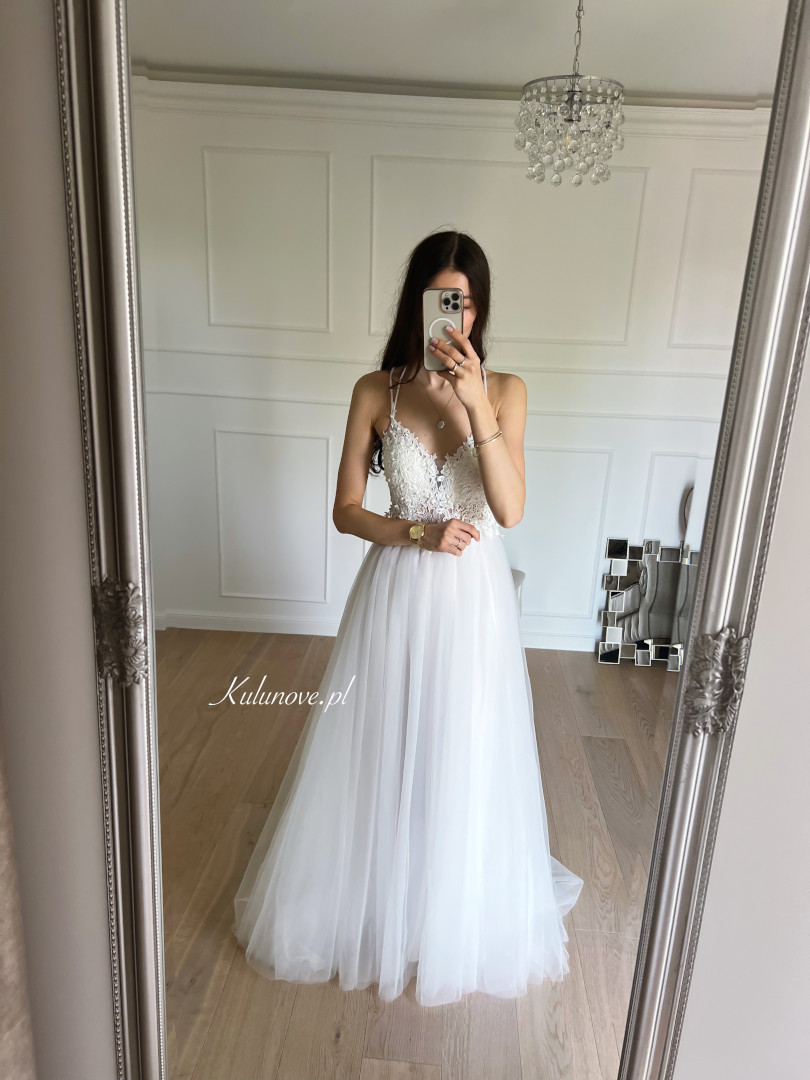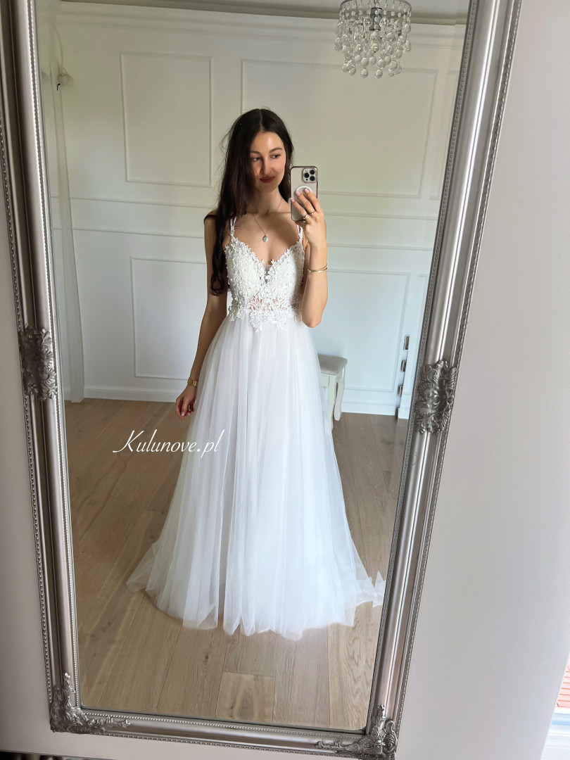 Please take special care when fastening the dress. We suggest making sure the tulle is evenly aligned and not too close to the zipper before fastening. Attention to this detail will help avoid accidental damage and prolong the life of the product.