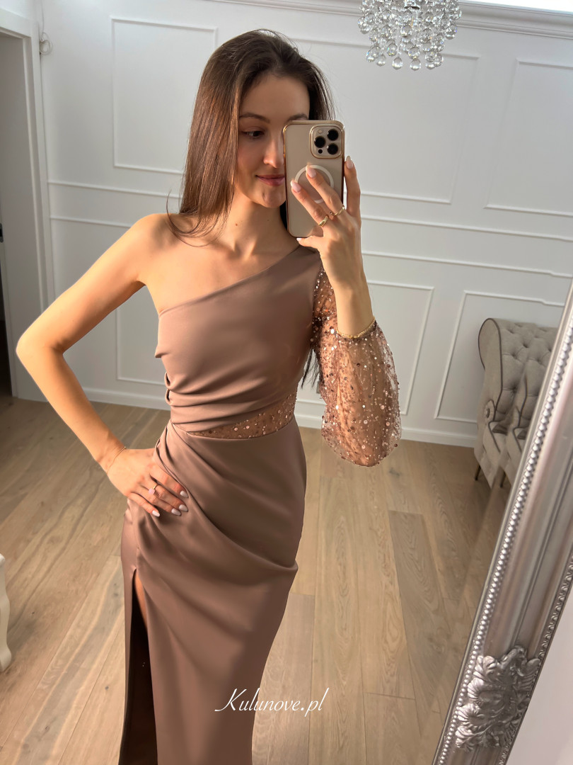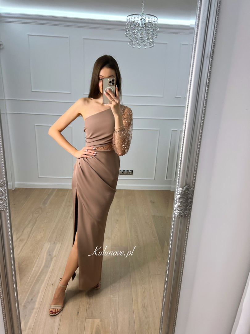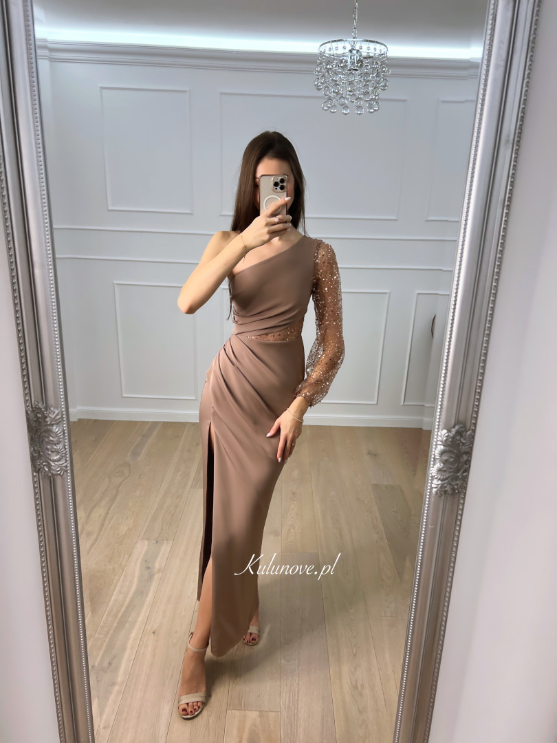 The cutout at the waist as well as the entire sleeve is beautifully decorated with sequins.