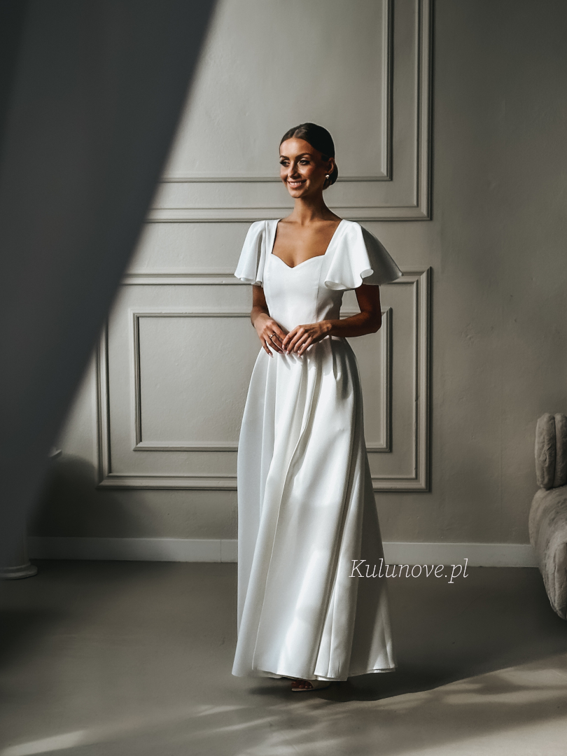The dress has a classic yet modern character. The top of the dress features a heart neckline that subtly exposes the shoulders and neck.