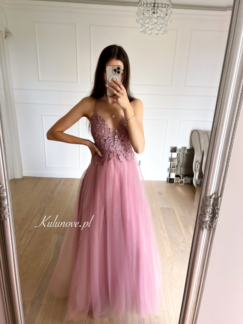 The dress has beautiful embellishments on the bodice.