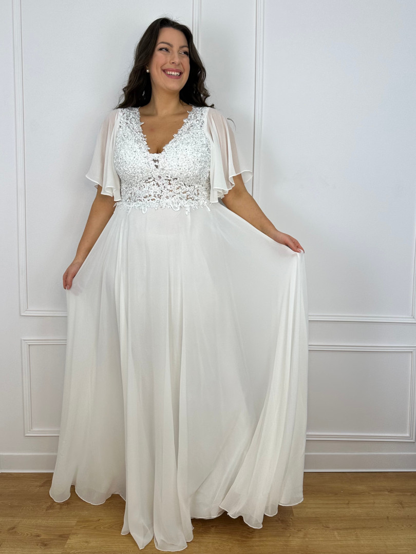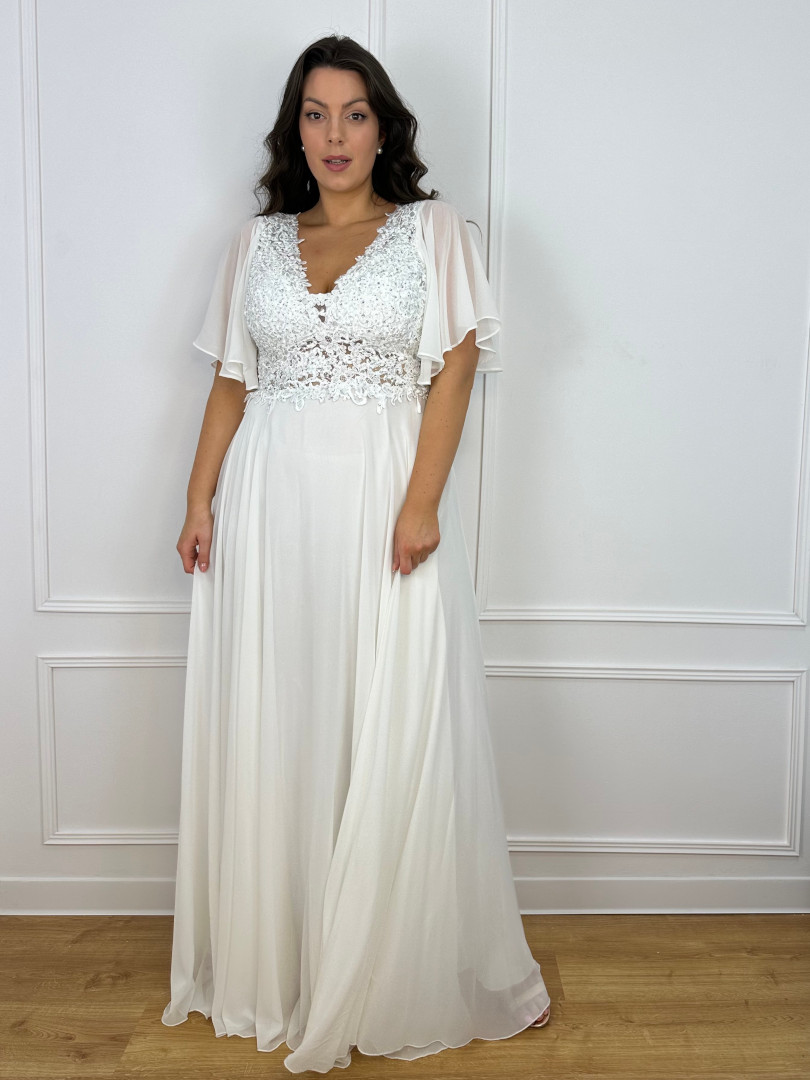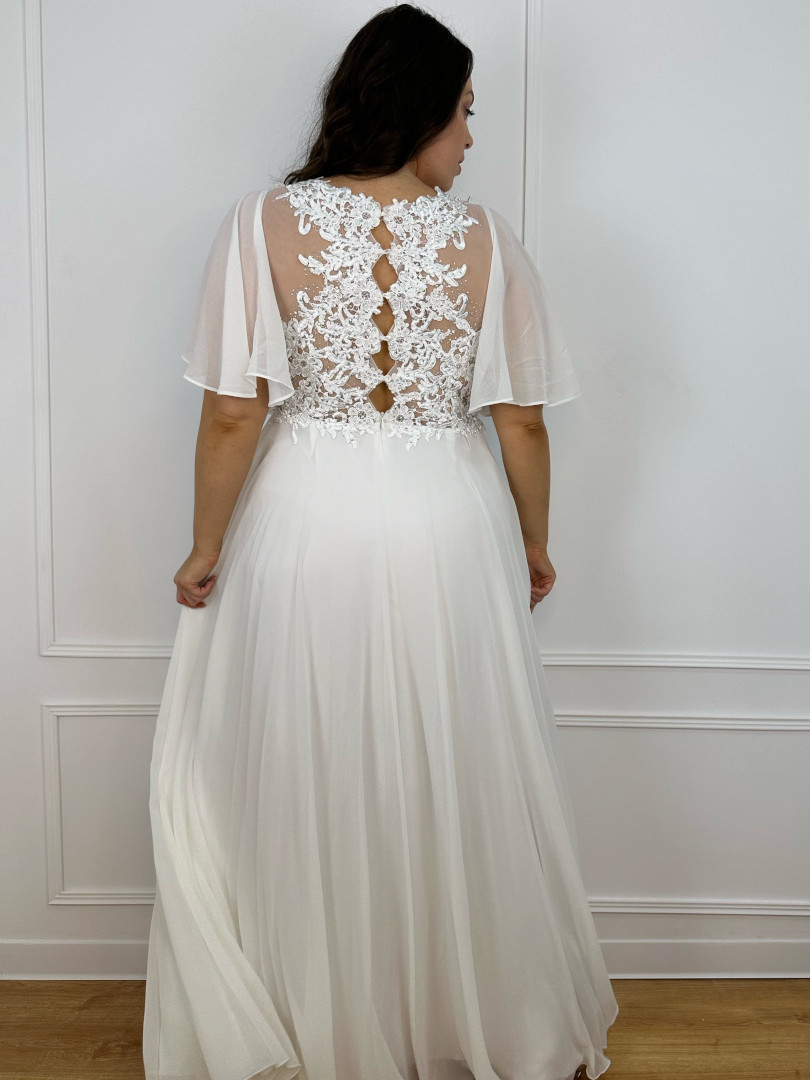 An airy plus size wedding dress with delicate sleeves and a V neckline.