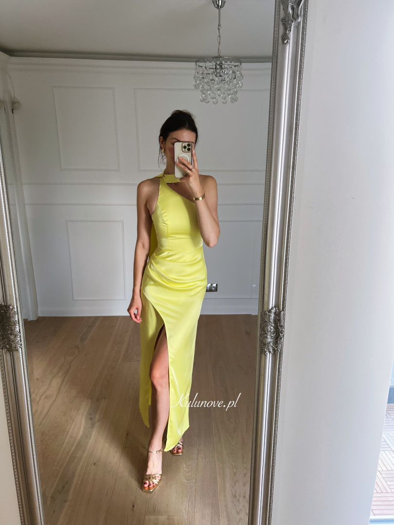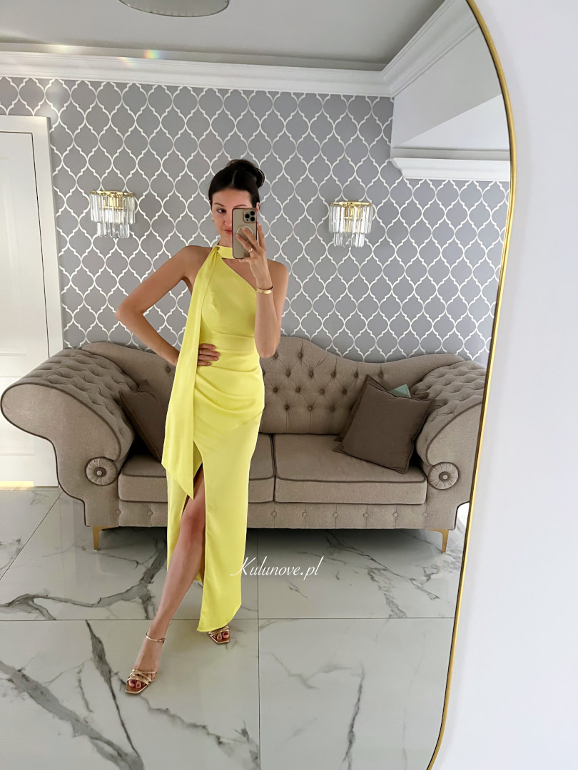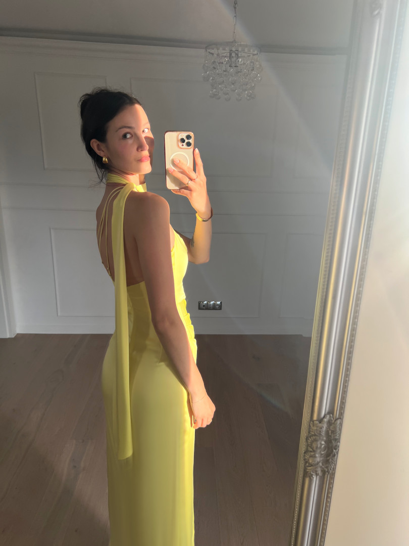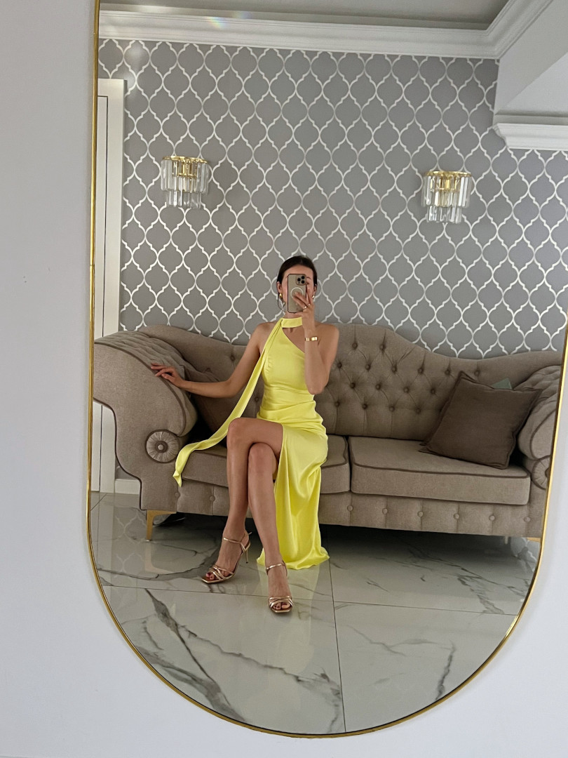 The top is asymmetrical, over one shoulder, which gives a modern look.