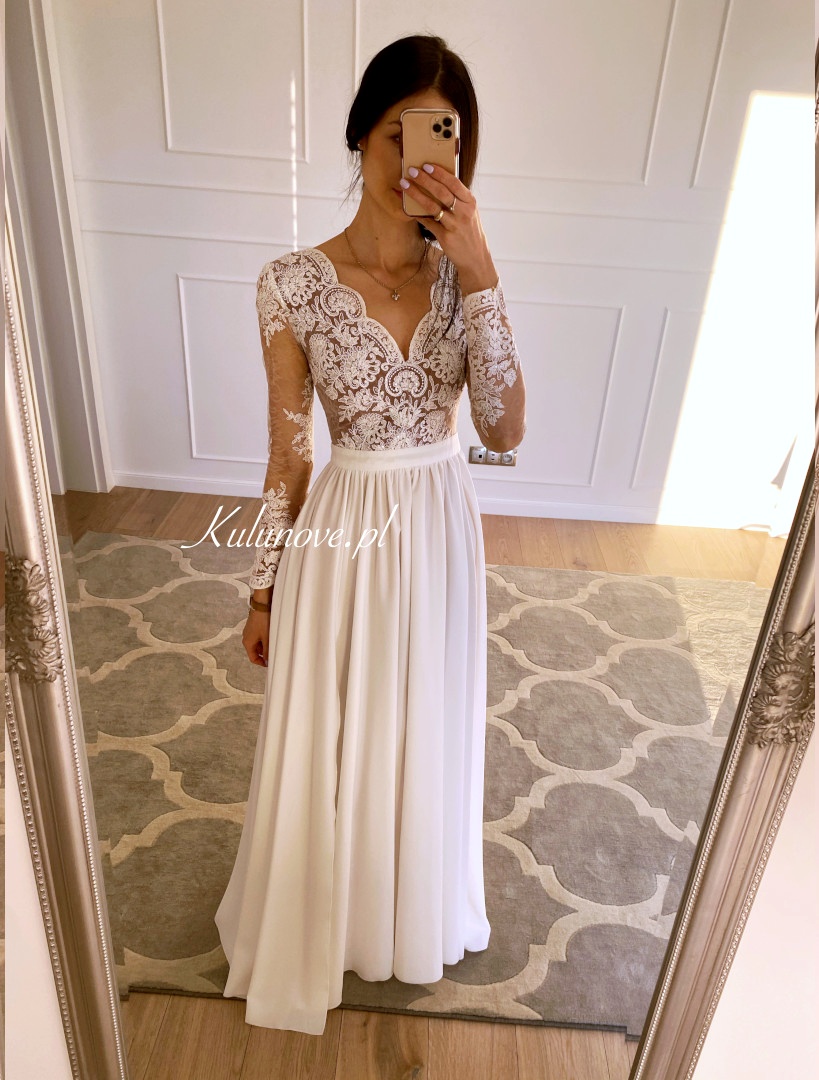 Marietta - biała suknia ślubna na długi rękaw z beżowym podszyciem