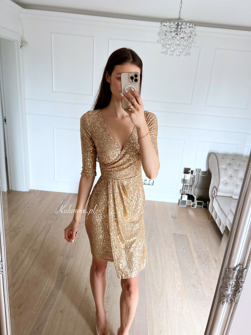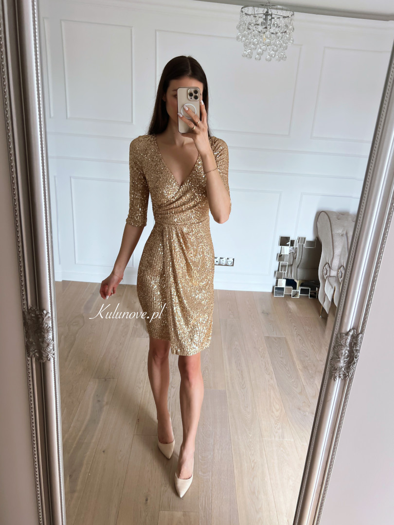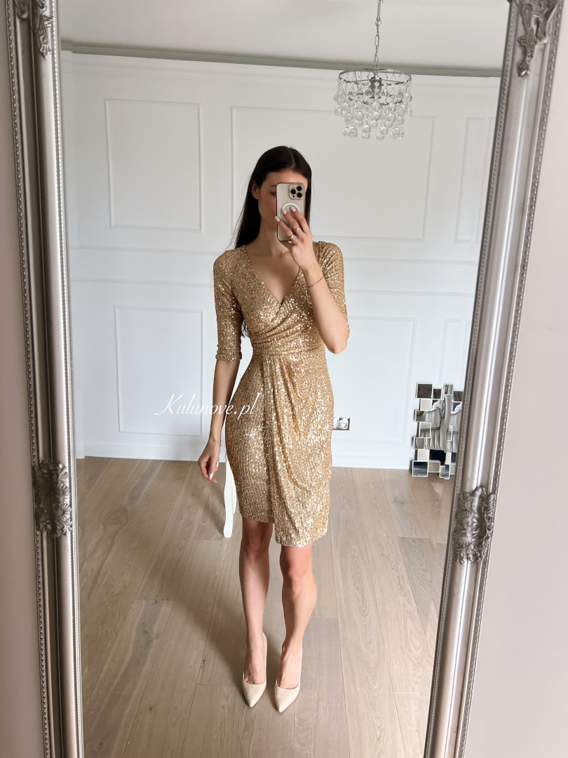 Monaco - gold sequin pencil dress with 3/4 sleeves.