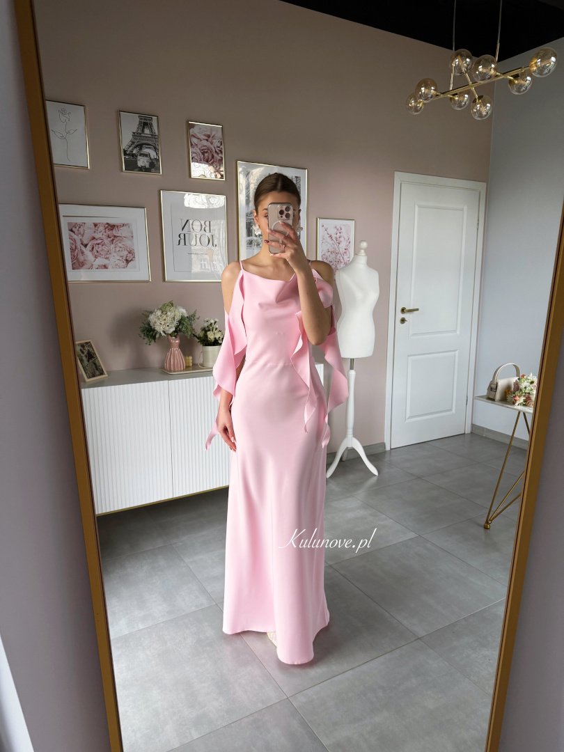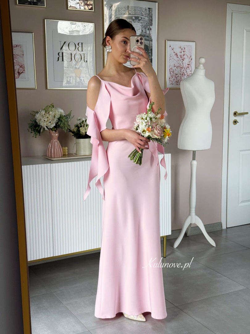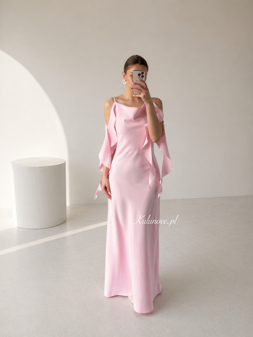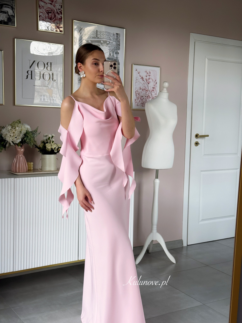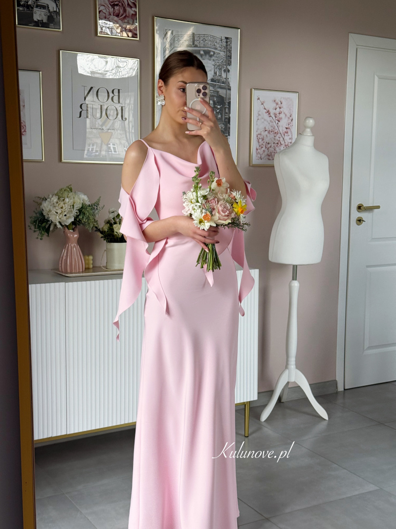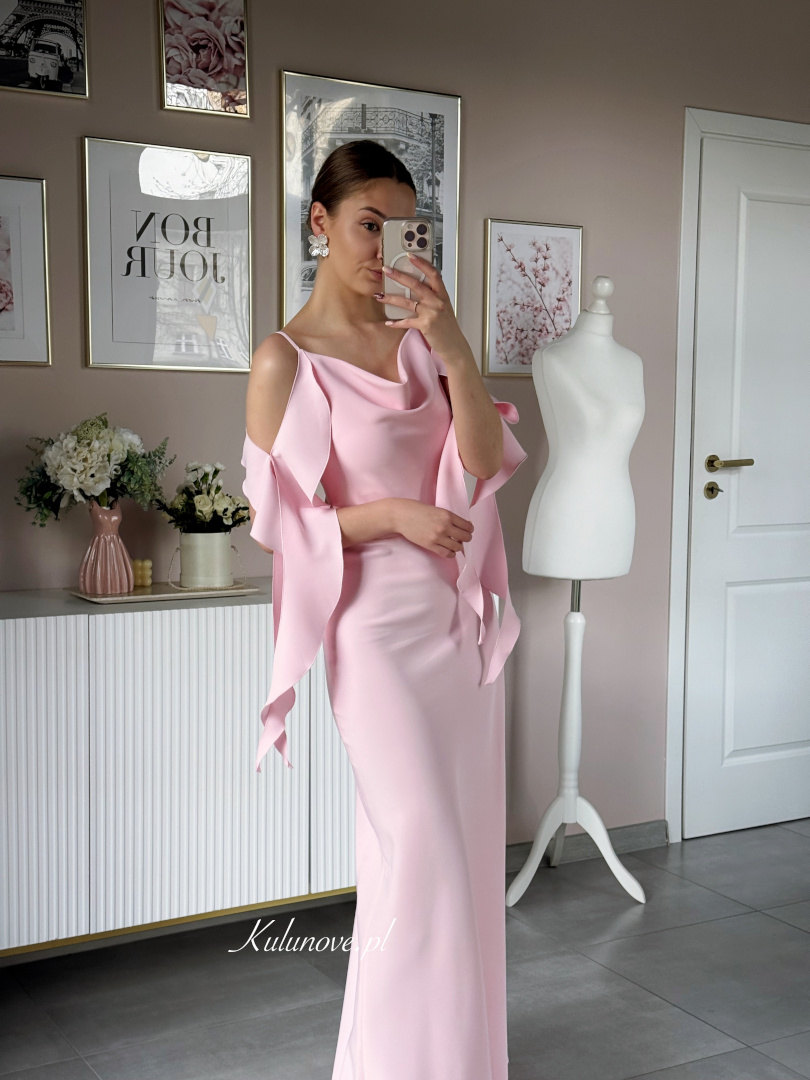 Sashes sewn on the shoulder line create an airy, asymmetrical element, which distinguishes the cut.