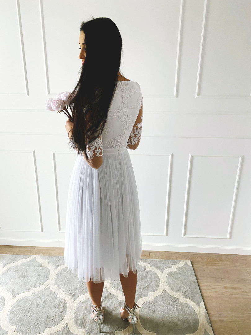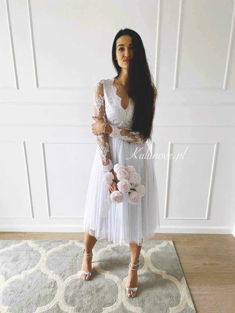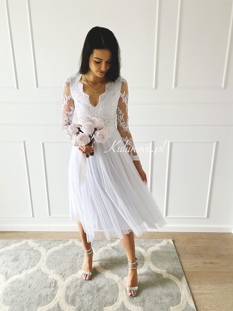 Phenomenal dress with beautiful lace sleeves, which perfectly emphasizes the waist.