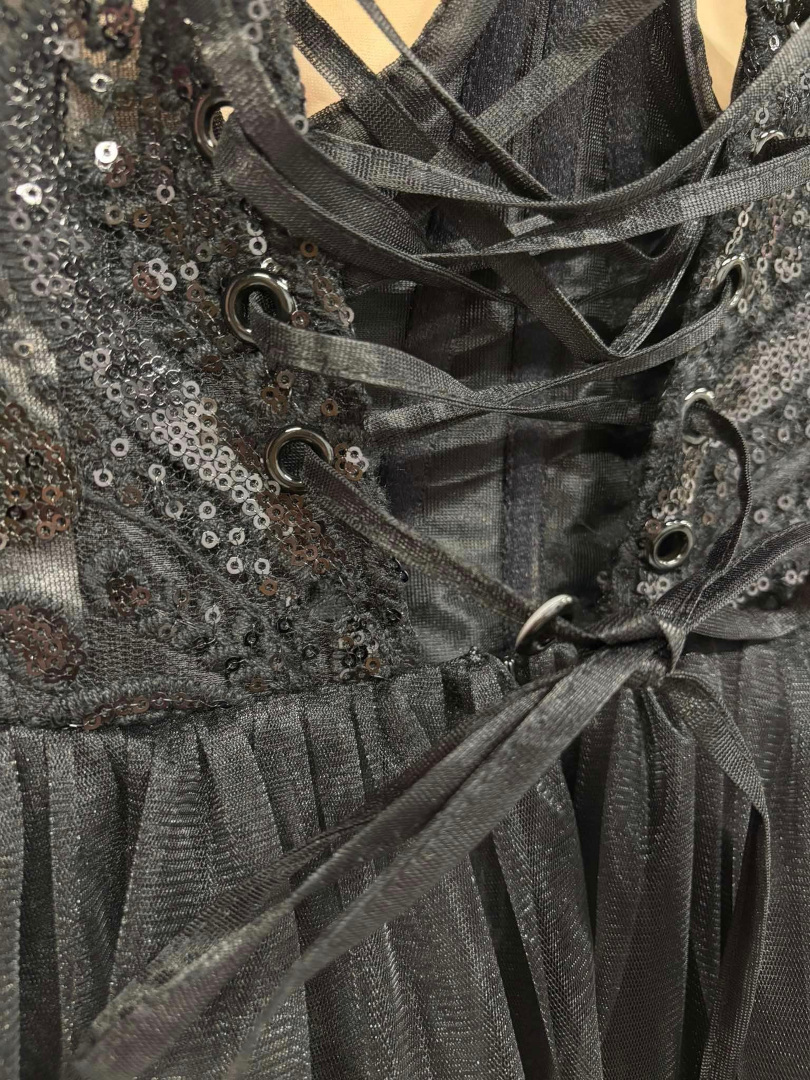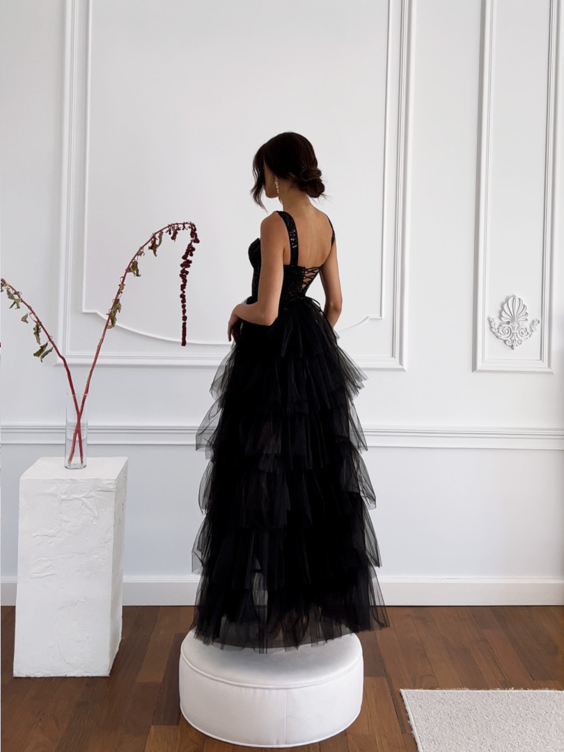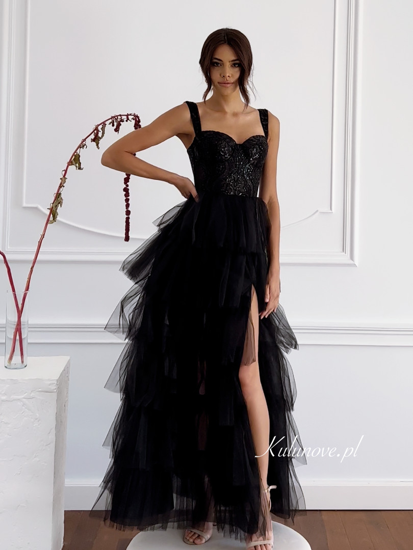 Octavia - black long princess dress with ruffles and sequin bodice