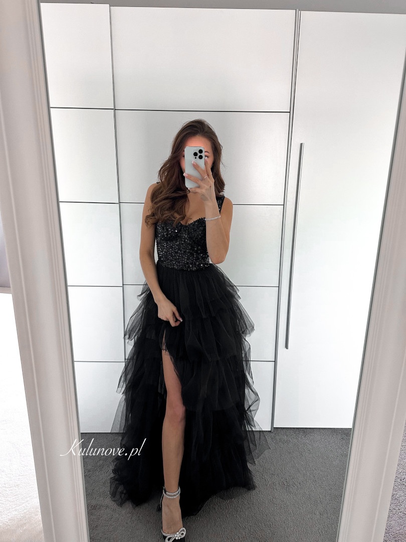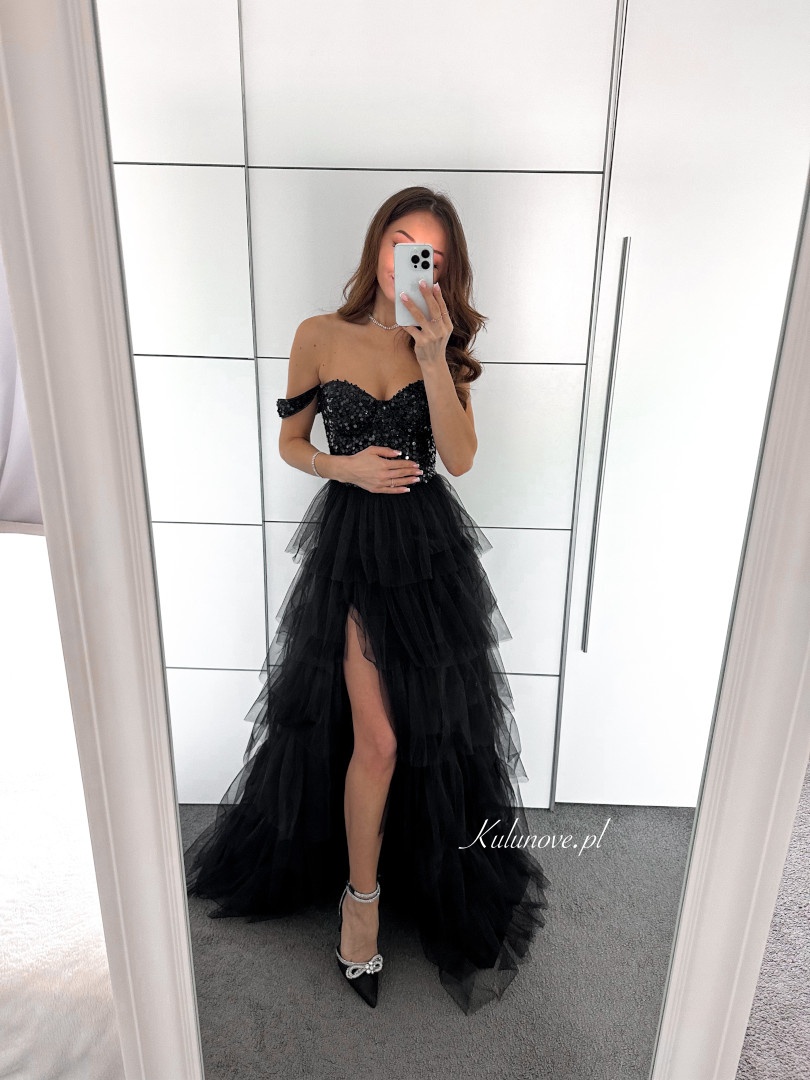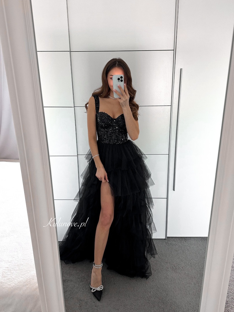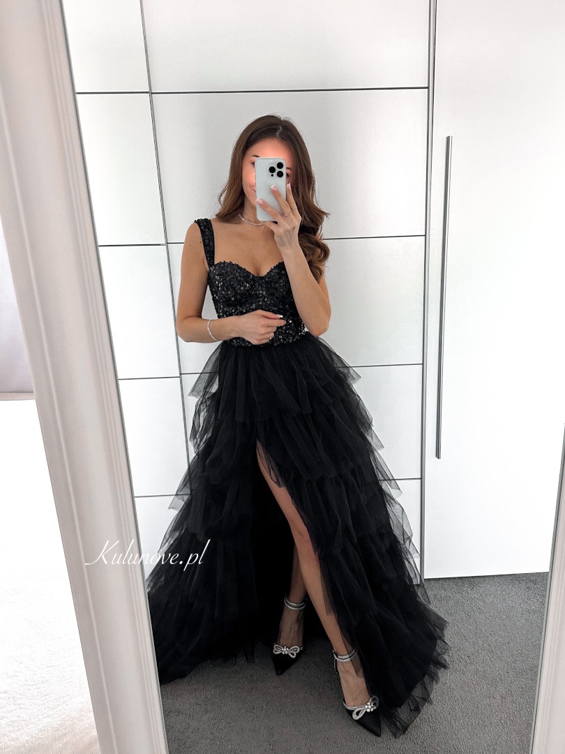 The skirt has several layers of tulle and an opening that exposes the leg.