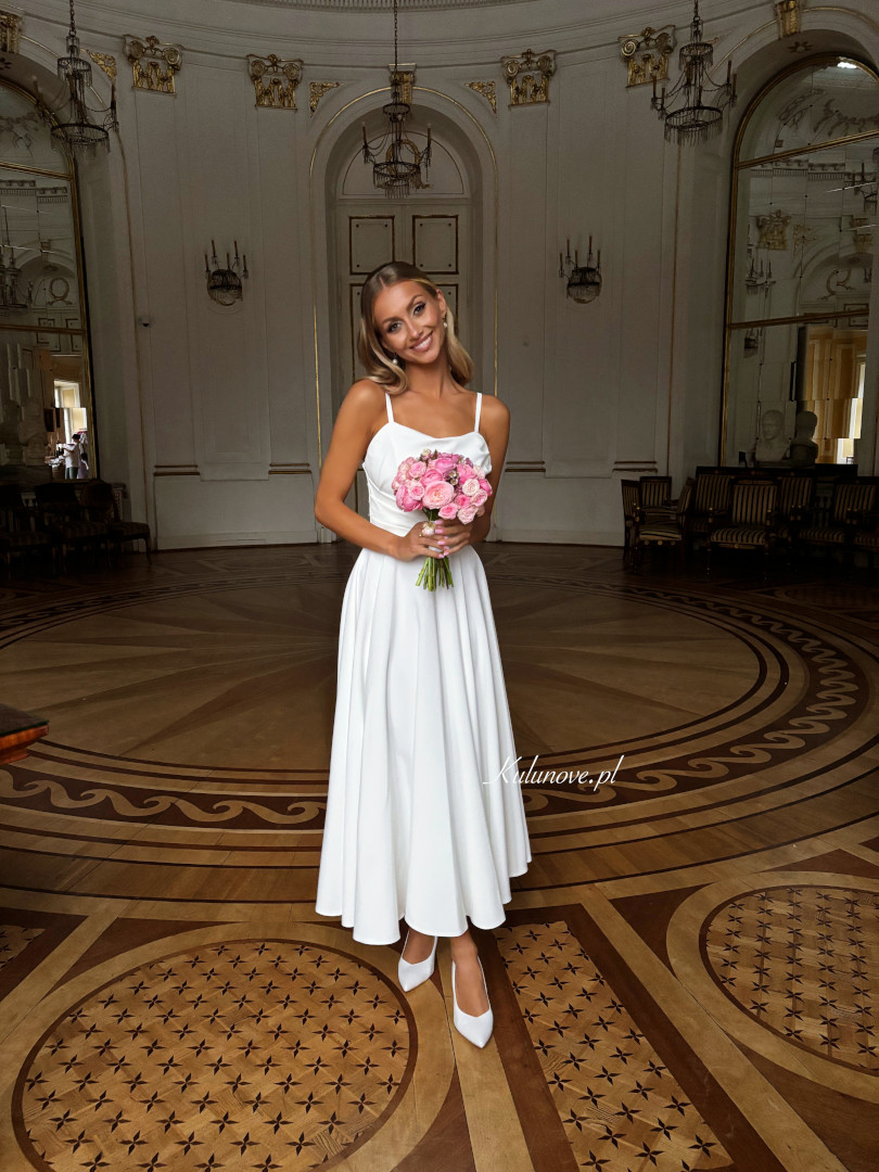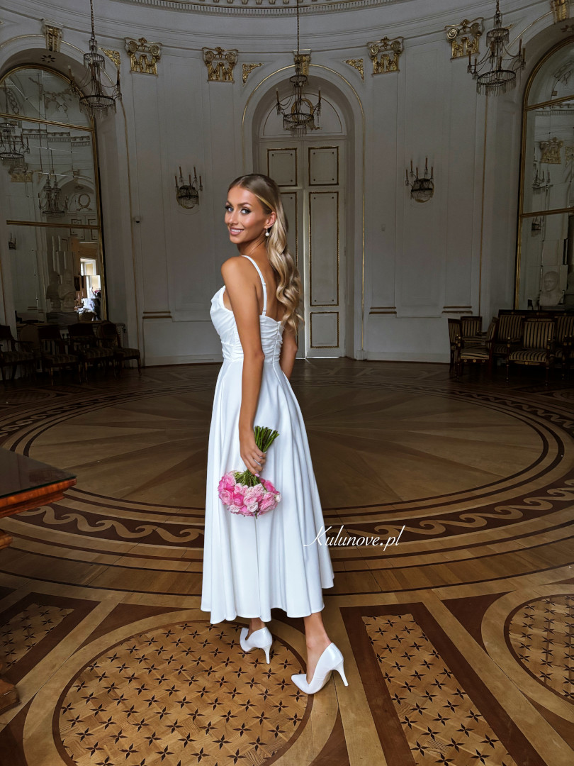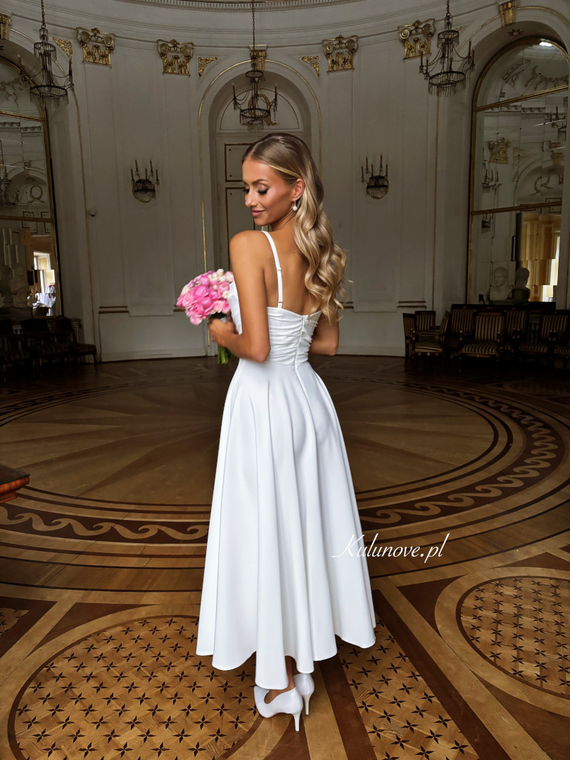 The corset top beautifully emphasizes the silhouette and exposes the neckline.