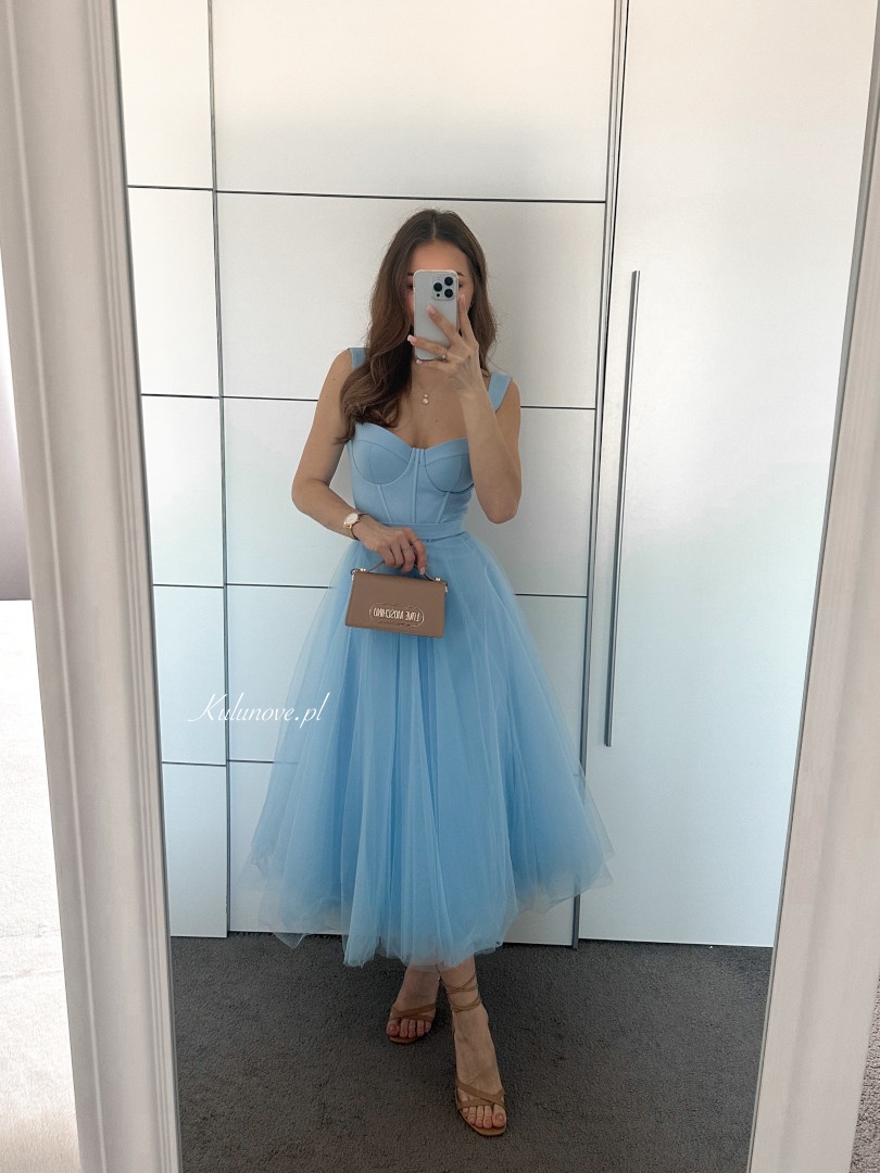 Promise midi A365 - blue airy strapless dress with padded bodice