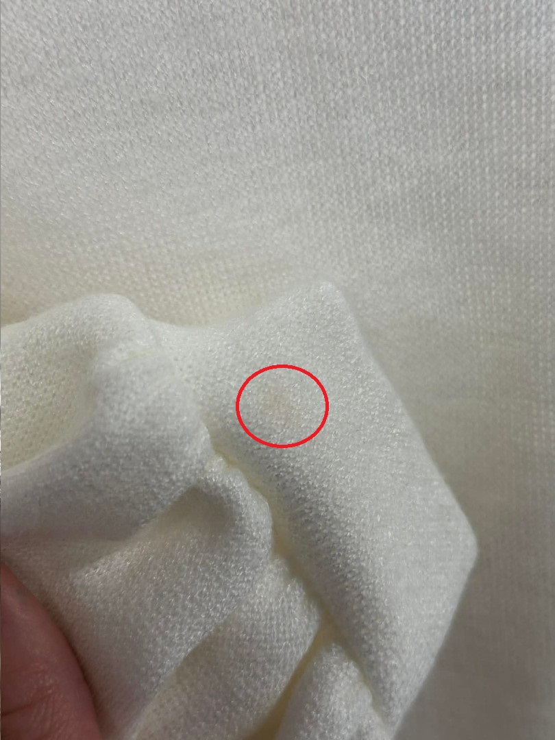 The sweater has a ripped sleeve at the cuff, and a small stain on the fabric at the cuff.