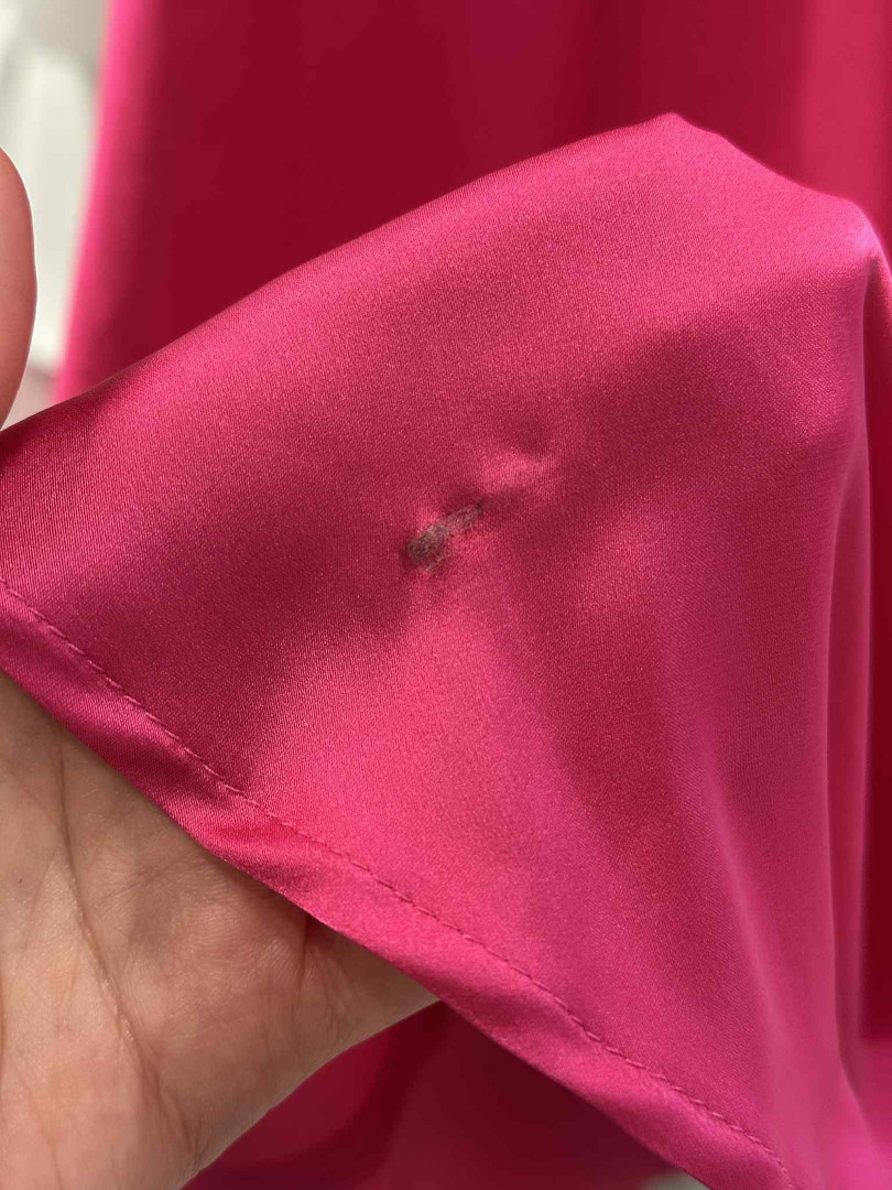 The dress has stains and a fabric blemish at the bottom of the dress.