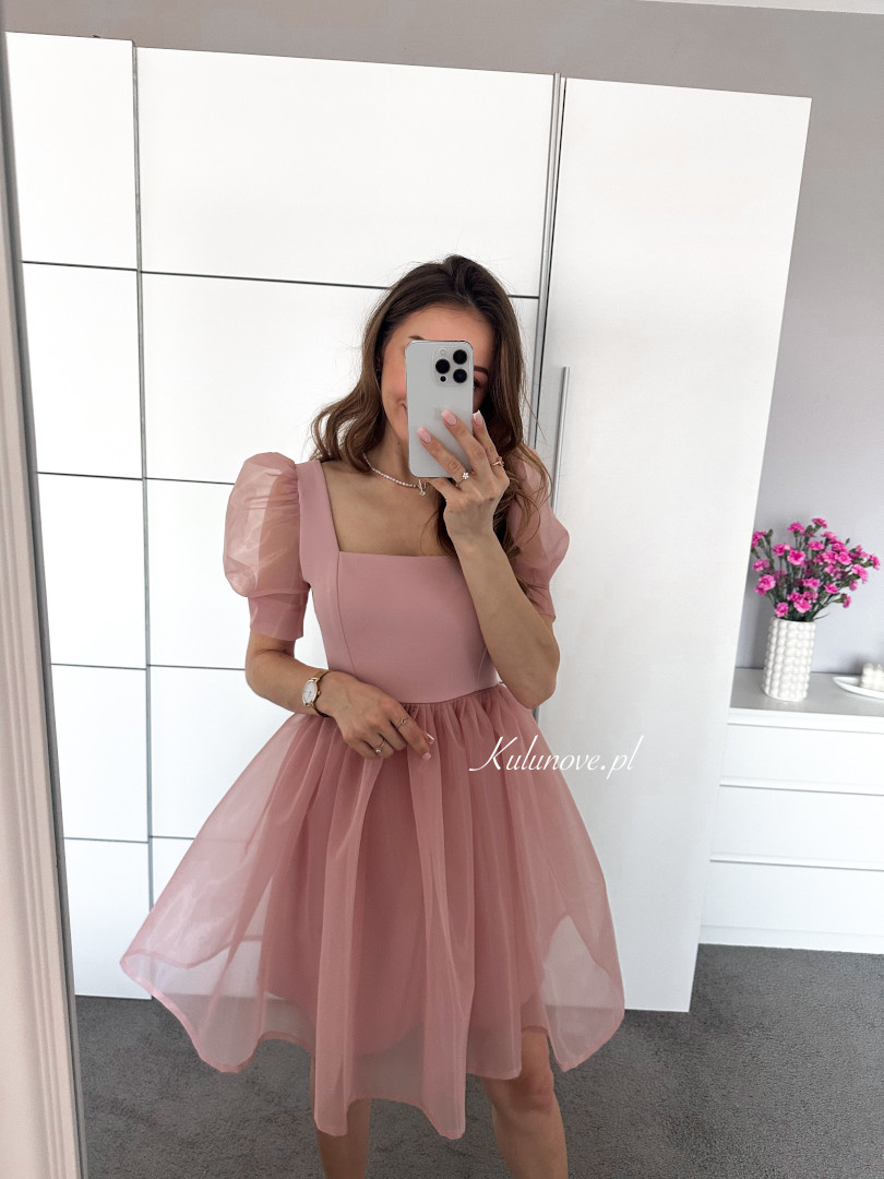 The square neckline emphasizes the shoulders, which are decorated with buff sleeves.