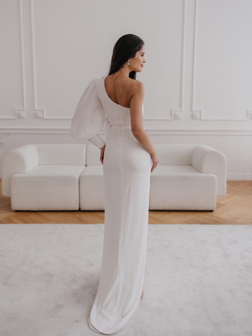 It has one long sleeve with a buffet, and fastens with a zipper at the back.