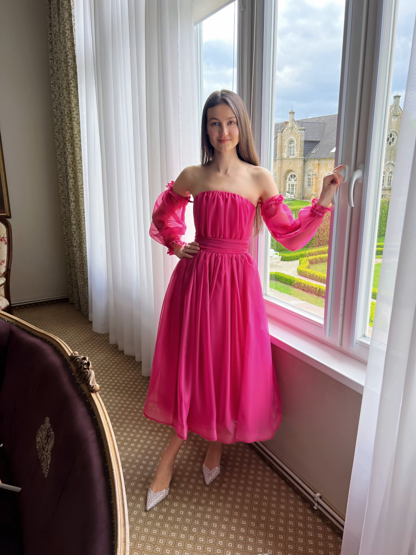 Roma midi - corseted short dress in fuchsia color with buff sleeves
