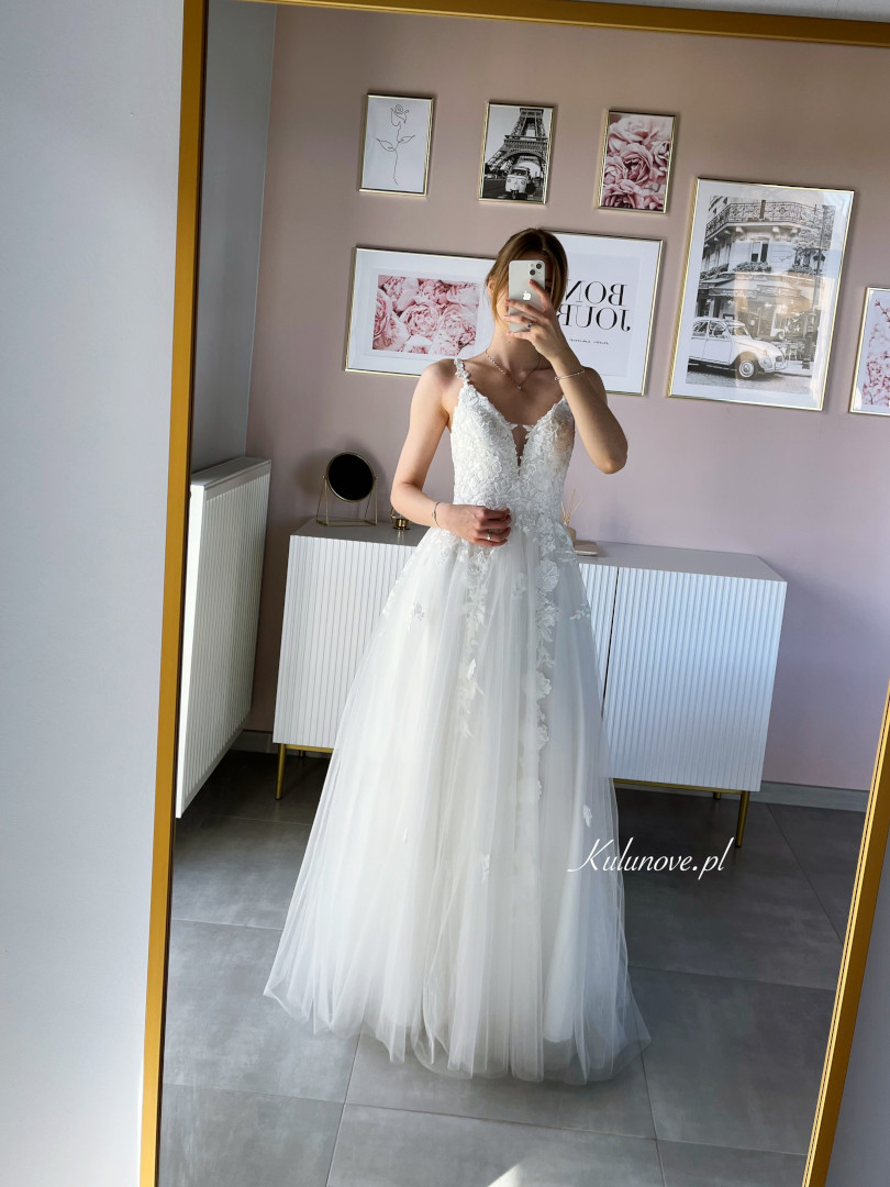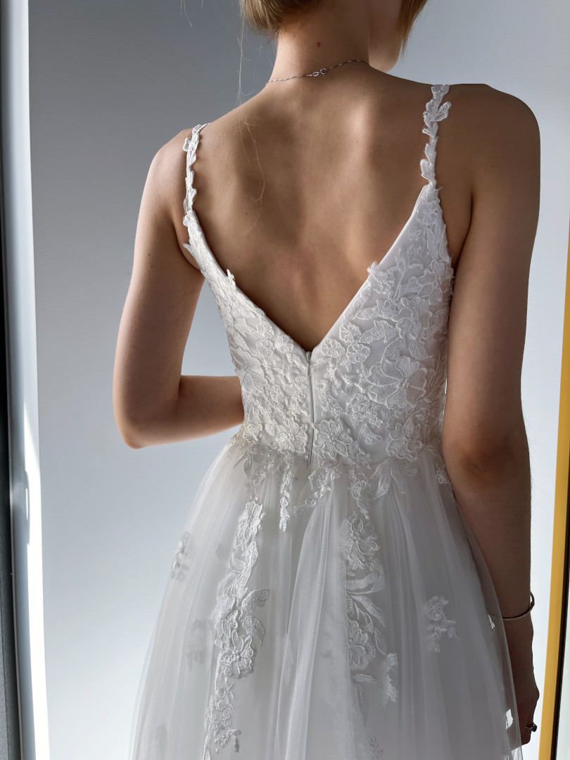 Please take extra care when fastening the dress. We suggest making sure the tulle is evenly aligned and not too close to the zipper before fastening. Attention to this detail will help avoid accidental damage and prolong the life of the product.