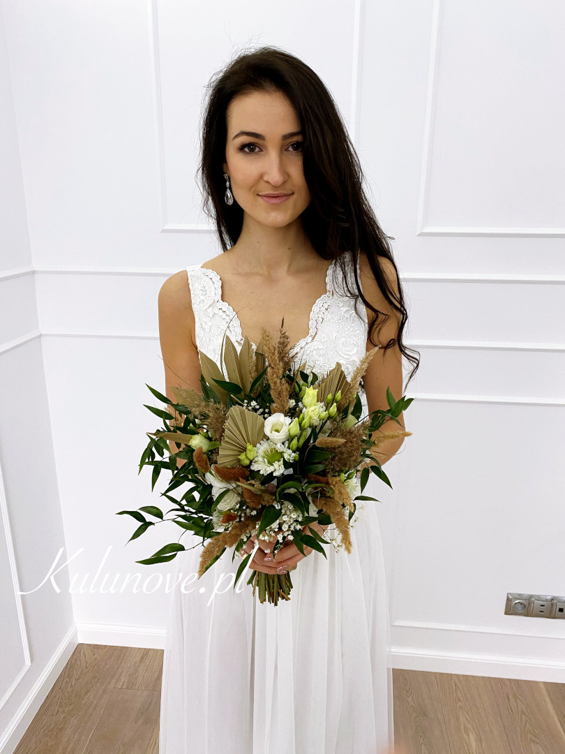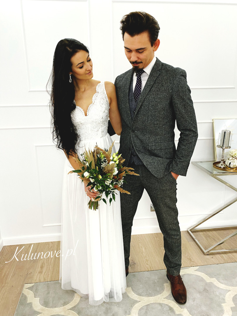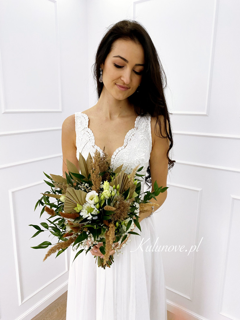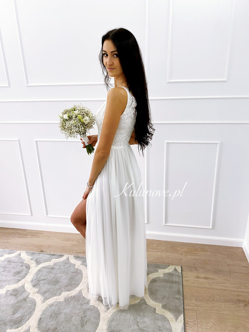 There are delicate sequins sewn on the bodice, which is a neutral color.