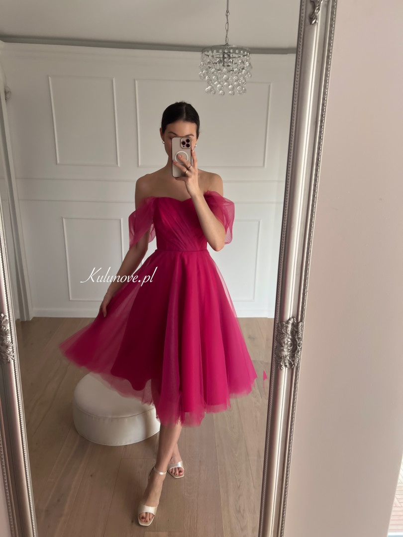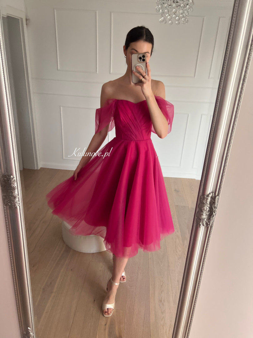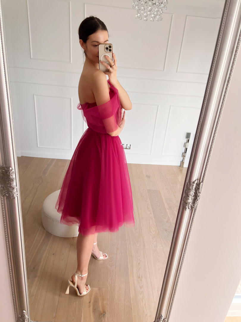 Selena - tulle midi dress with falling sleeves in fuchsia color
