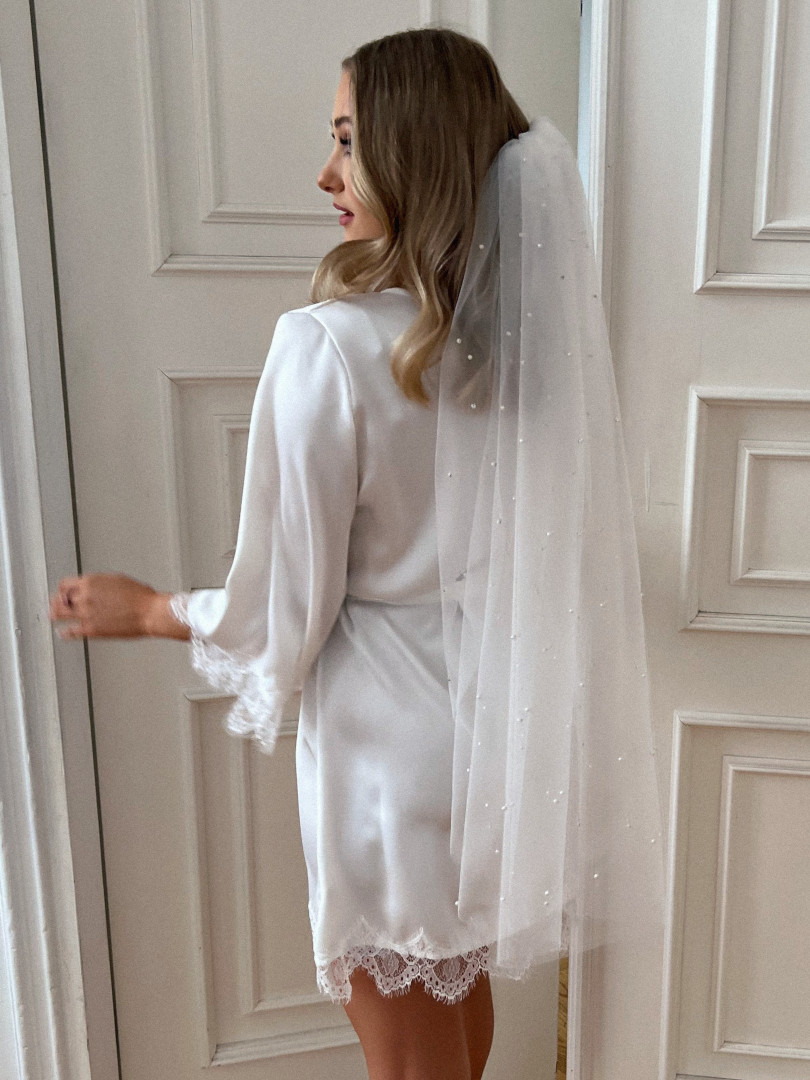 This veil will match in color with most of our models in ivory, cream and ecru.