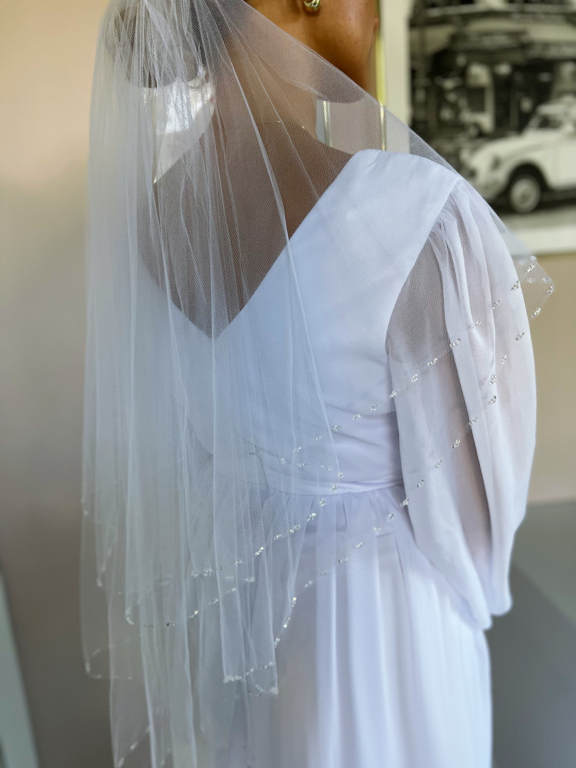 An elegant accessory that subtly complements a wedding outfit. Perfect for cooler days or as a stylish cover-up for a church ceremony.