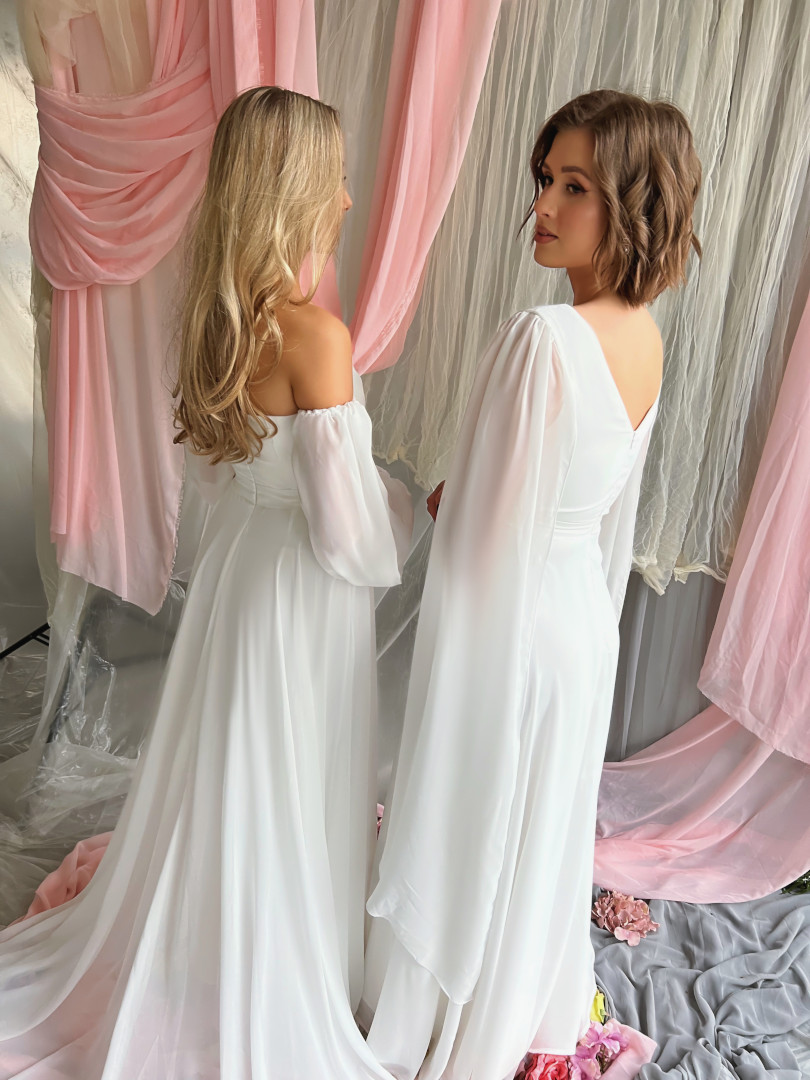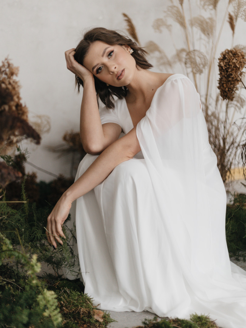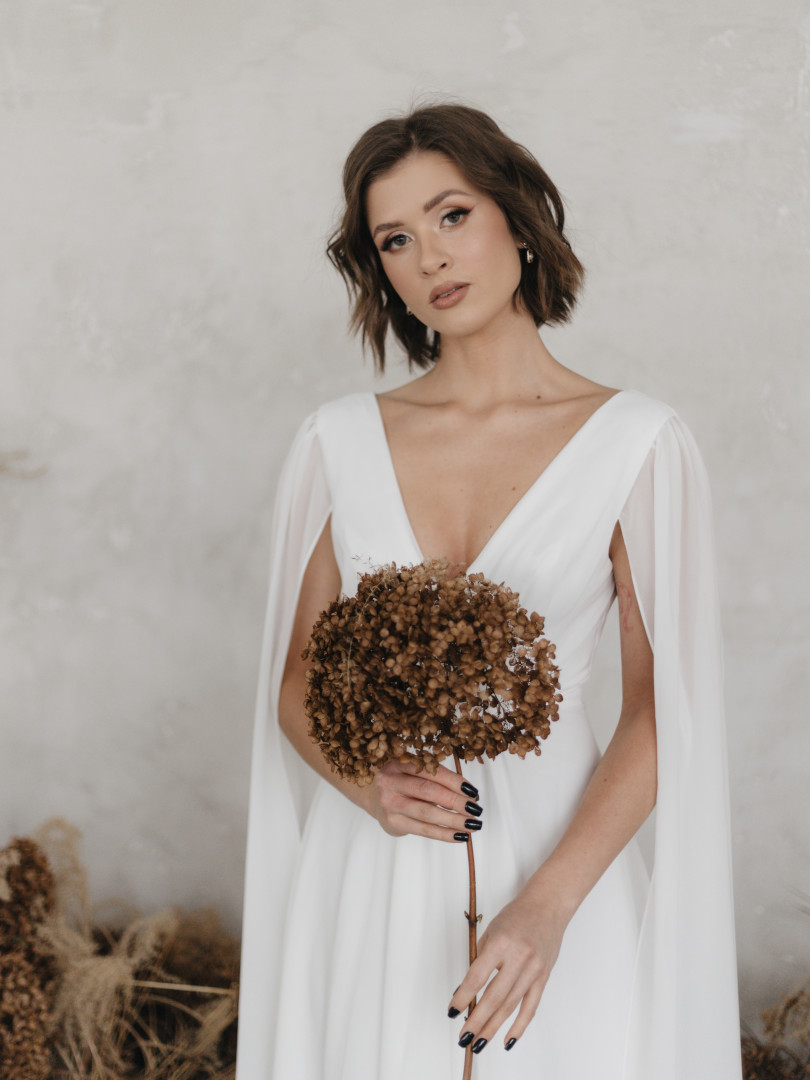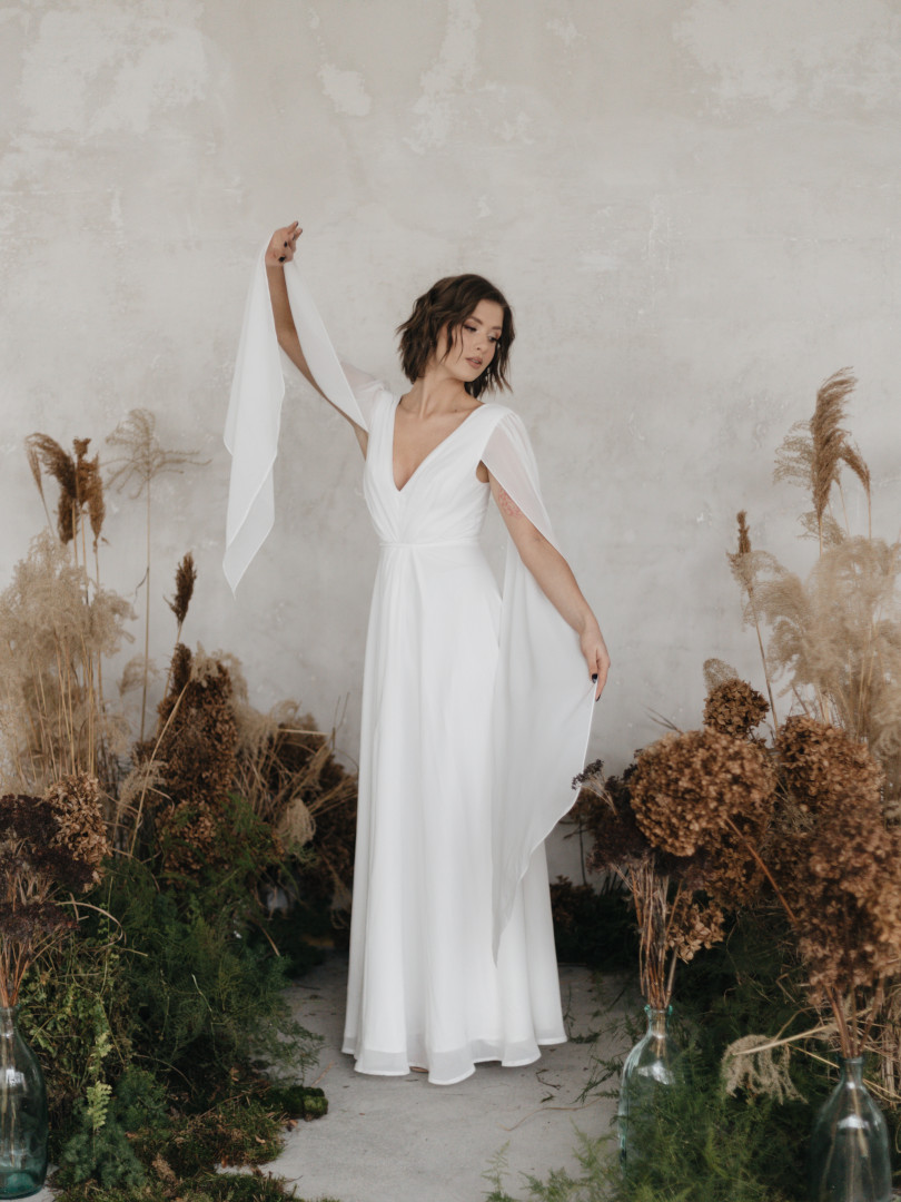 A very simple, airy wedding dress that delicately covers the shoulders with a chiffon embellishment.
