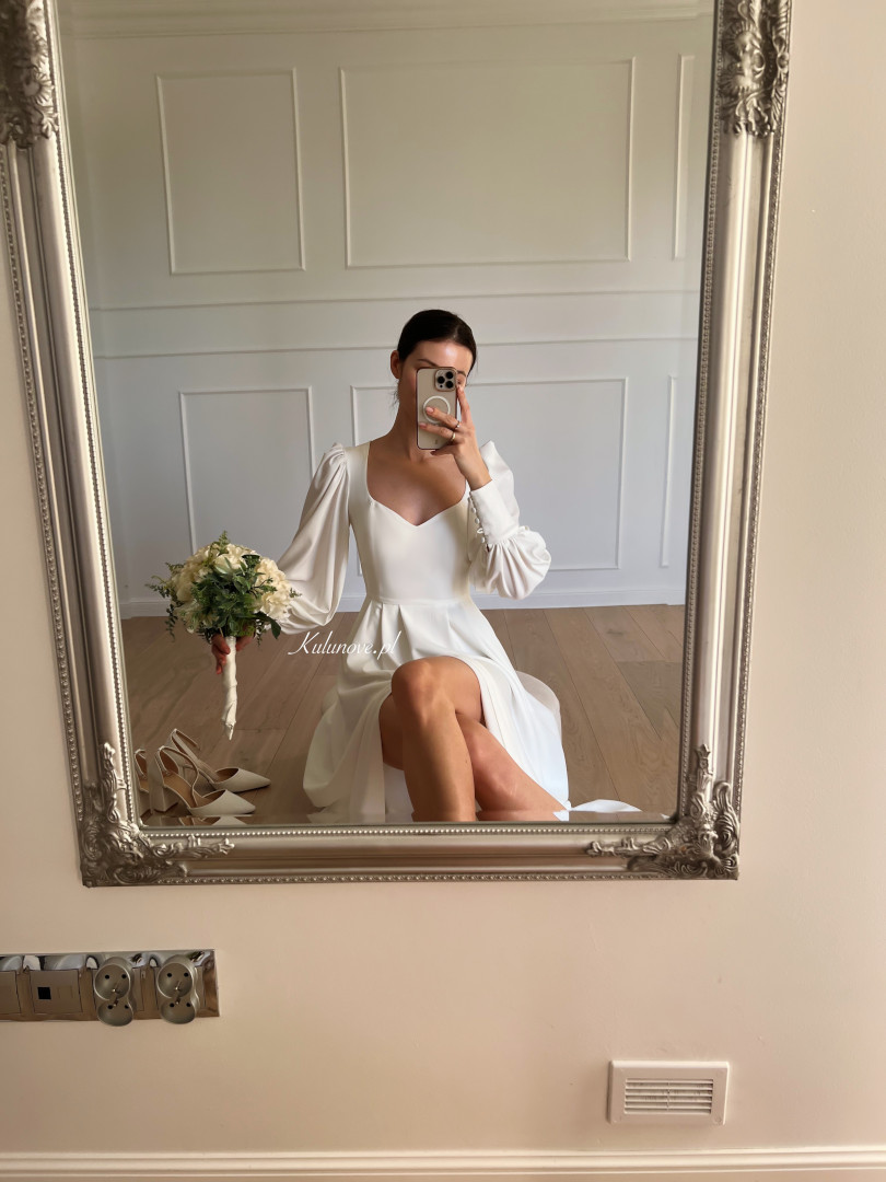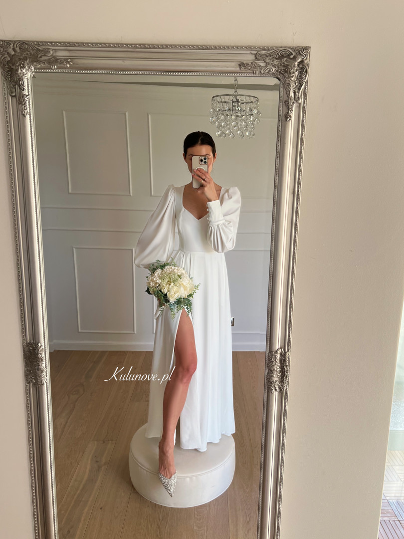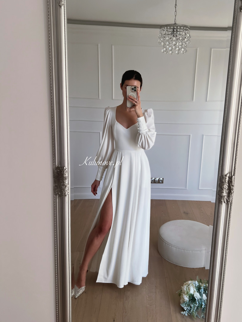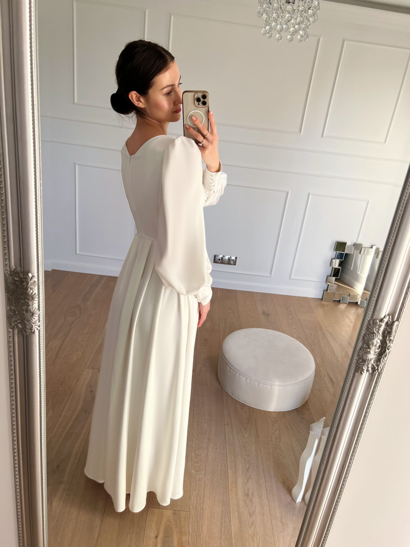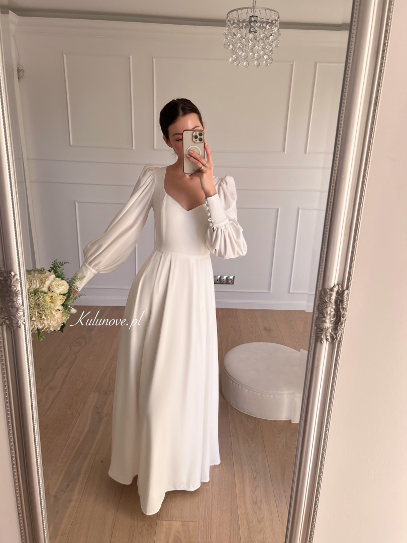 A flared long-sleeved wedding dress.