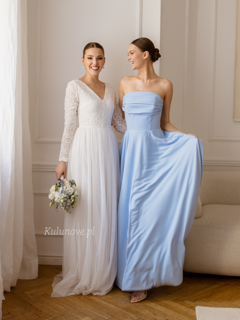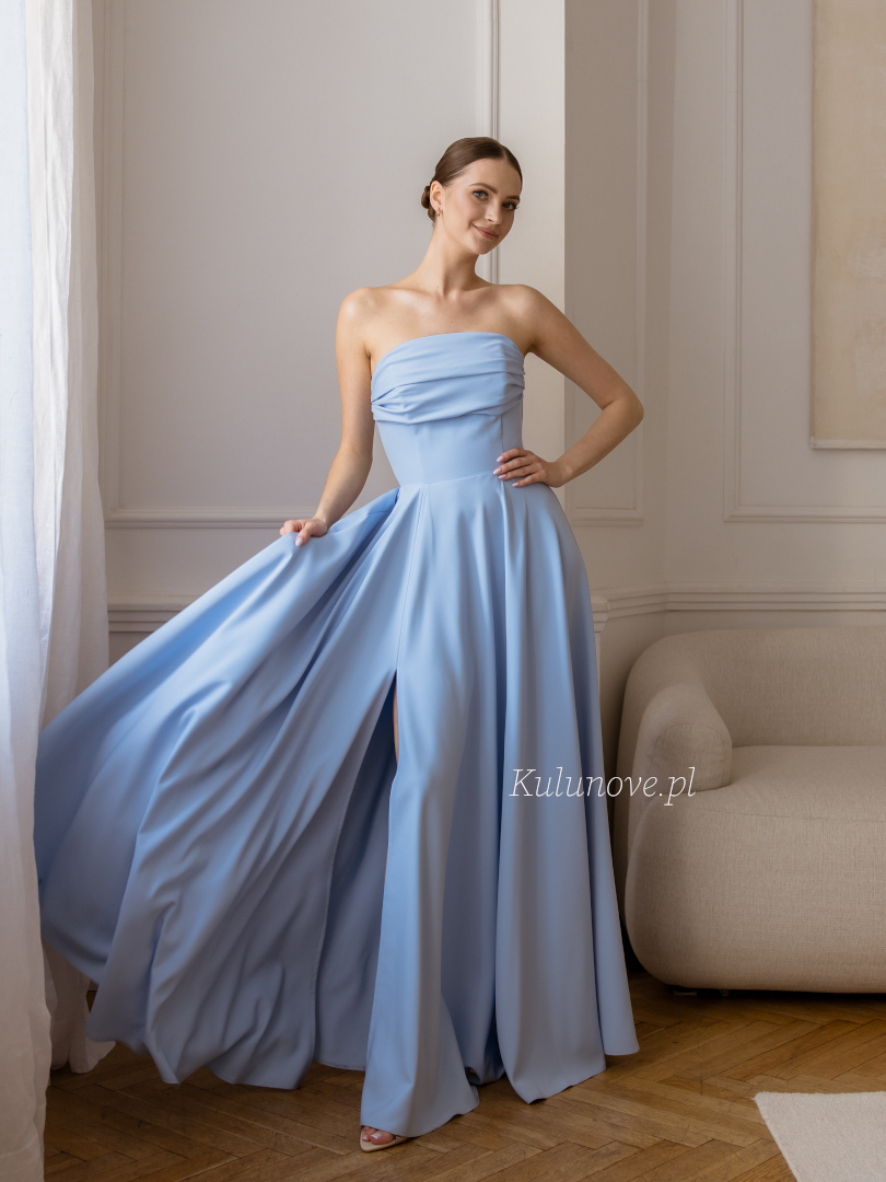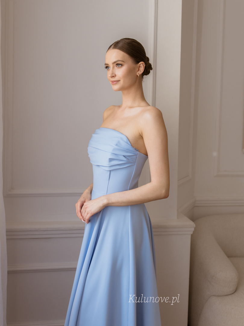 Tess - elegant blue strapless maxi dress with decorative neckline perfect for a wedding.