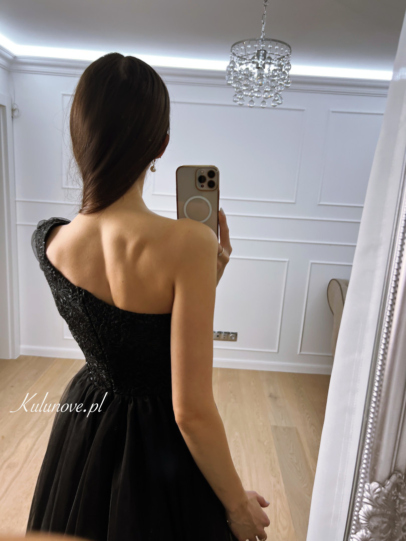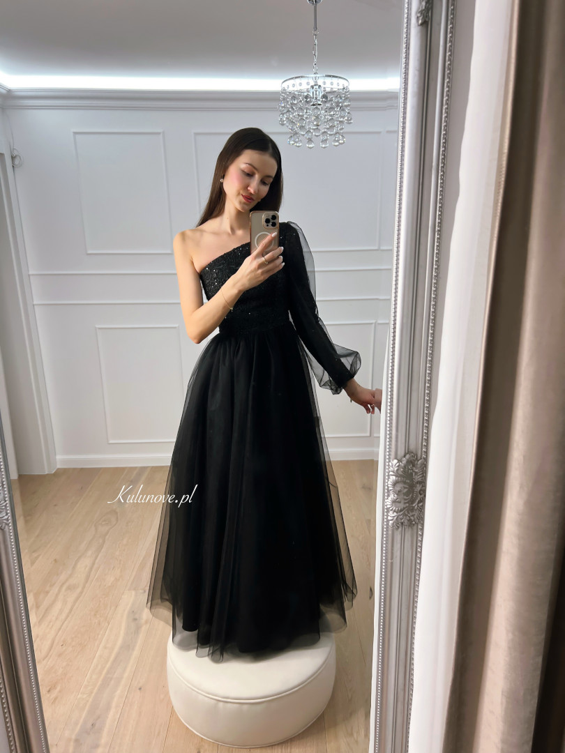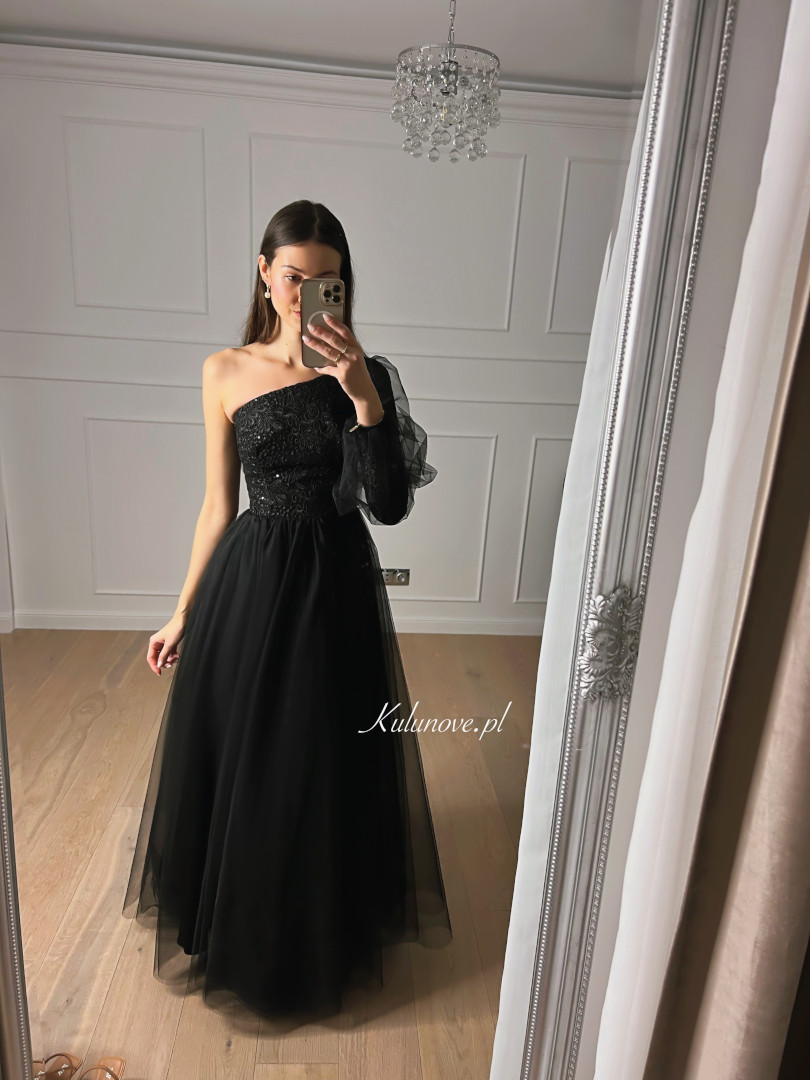 It has a long lace one-shoulder sleeve decorated with an additional tulle buffet.