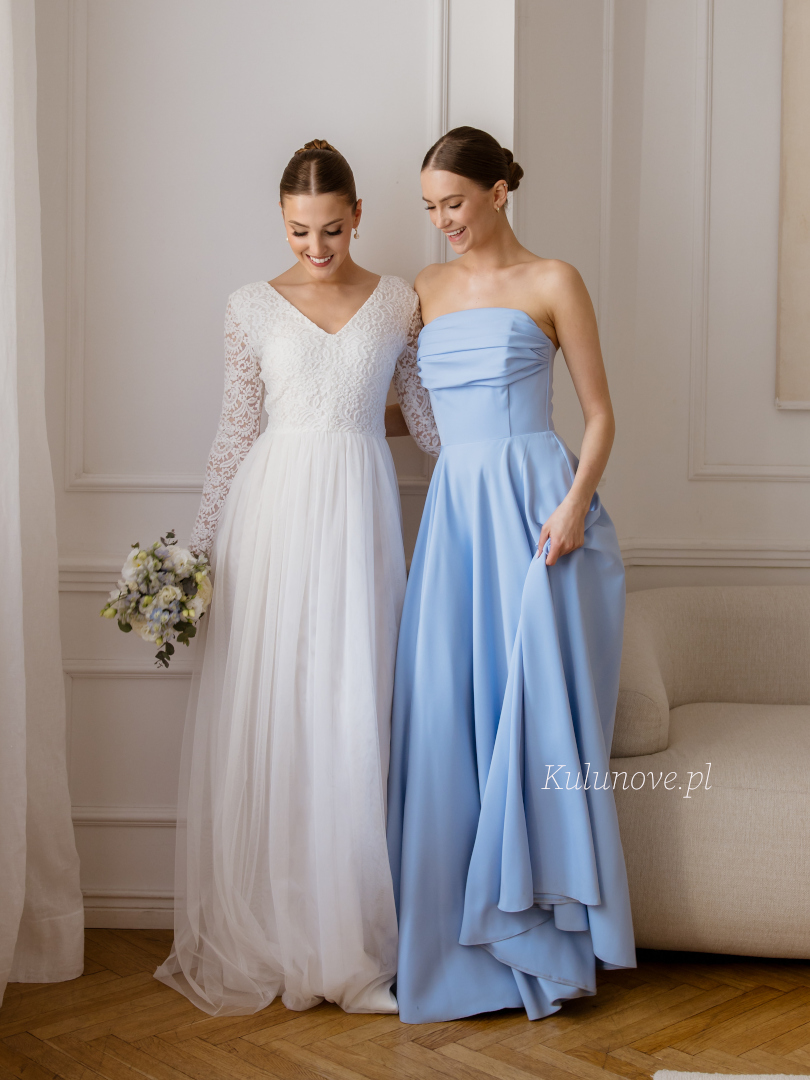 The bottom part is a softly flowing tulle skirt without a zipper, providing full freedom of movement and subtle volume without the effect of exaggeration.