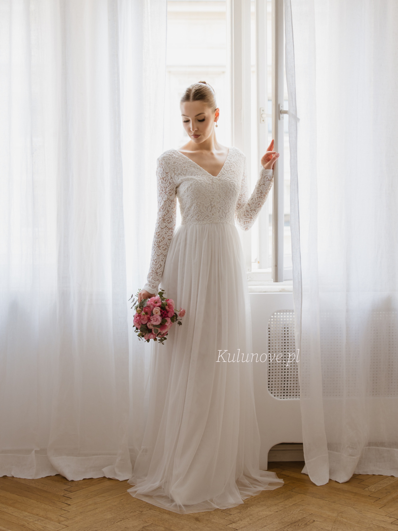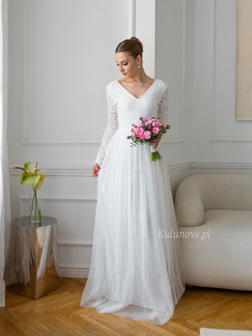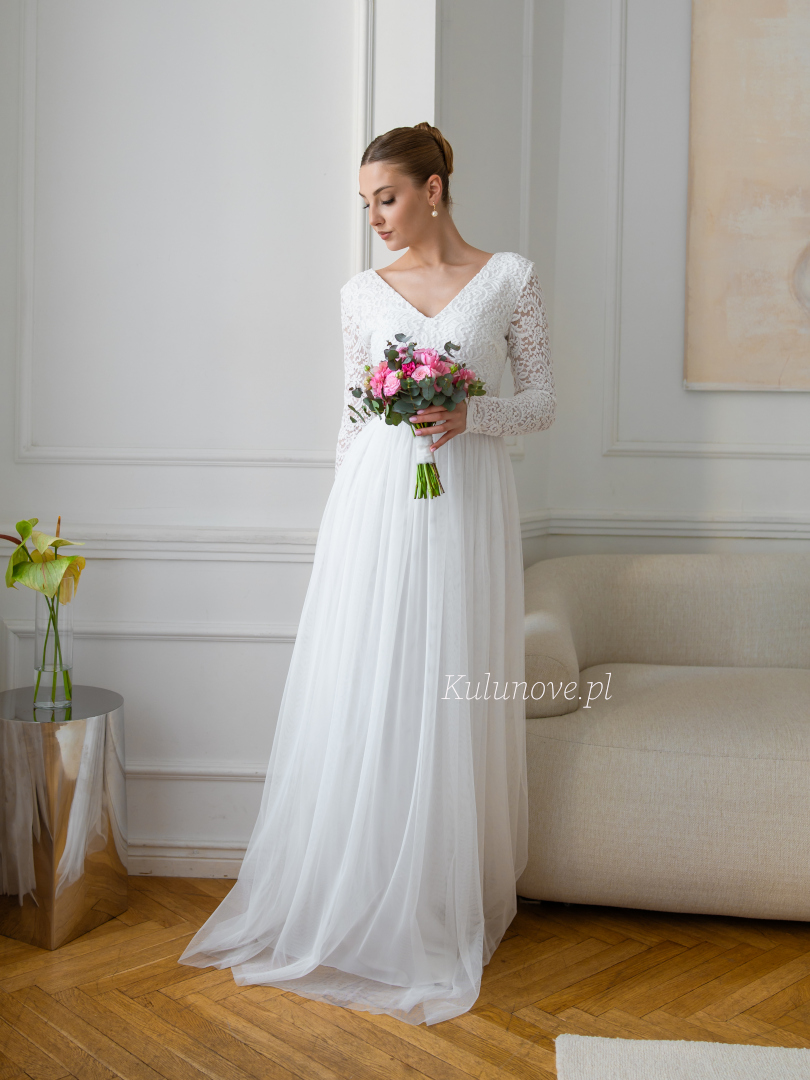 Long, lace sleeves add elegance and lightness, creating a harmonious whole with the delicate skirt.