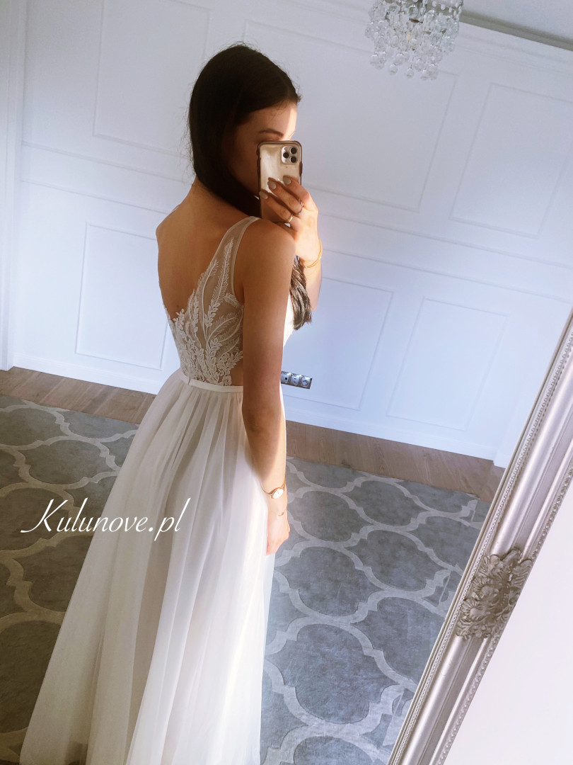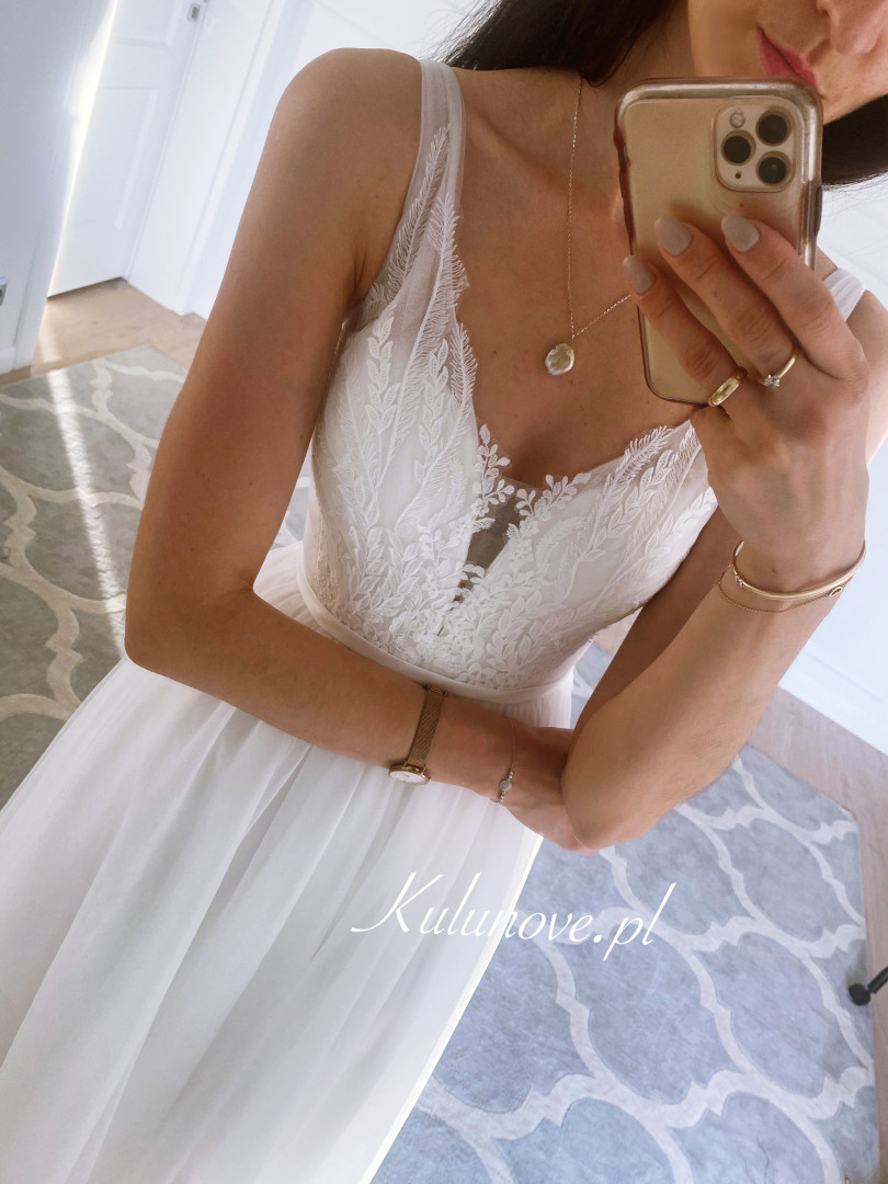 The bottom of the dress is two layers of tulle and a petticoat, so the creation has a delicate volume.