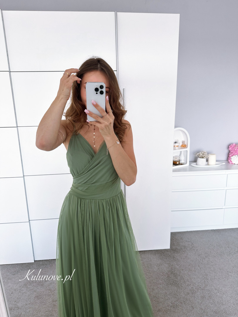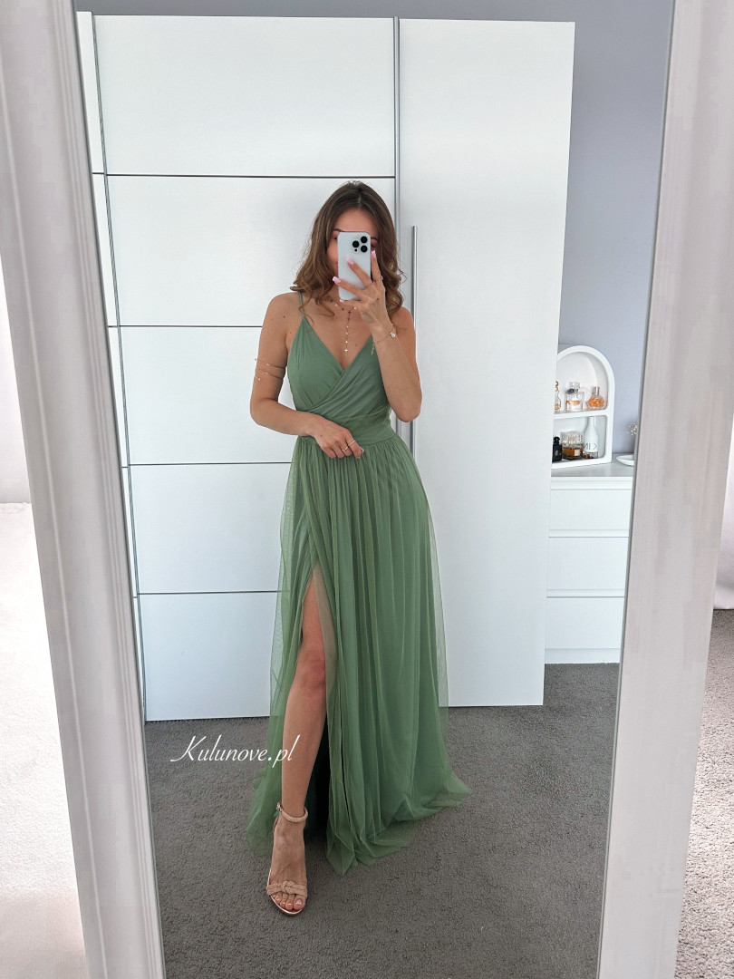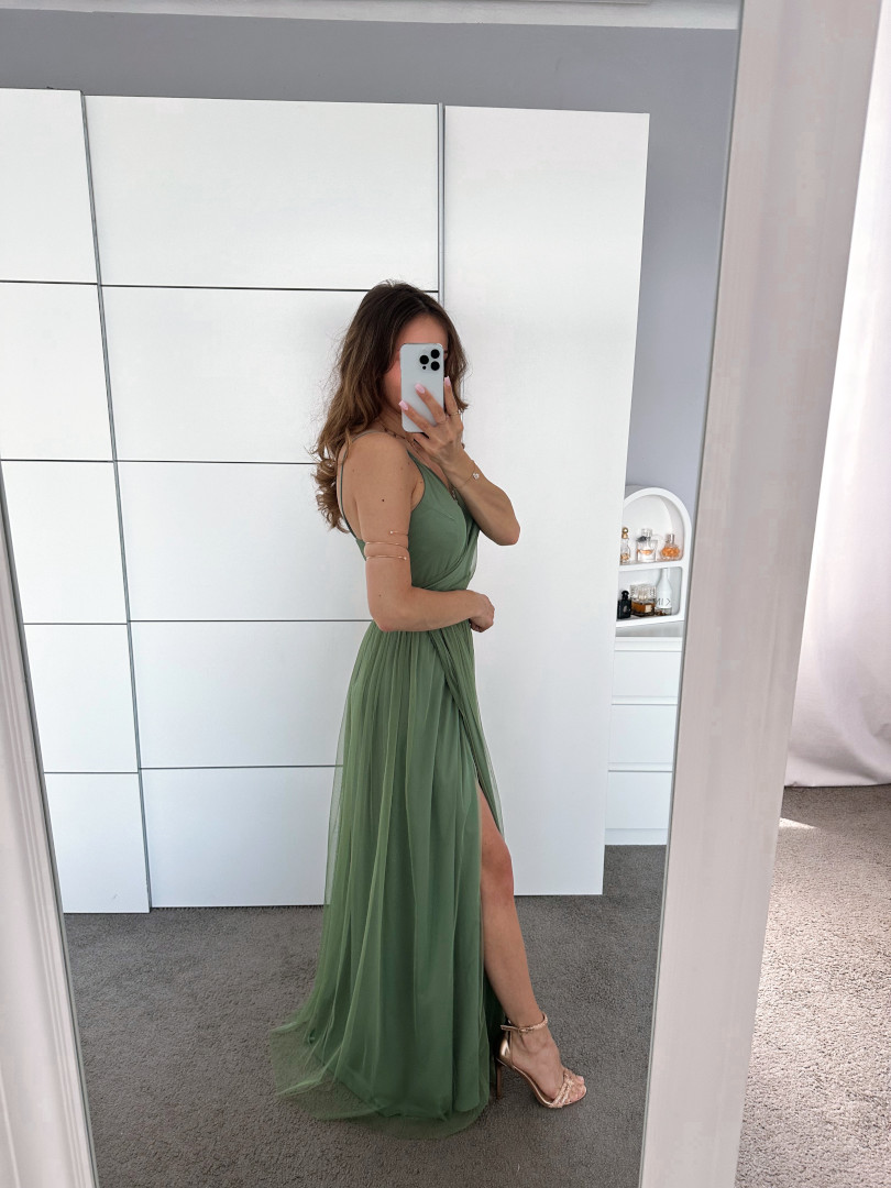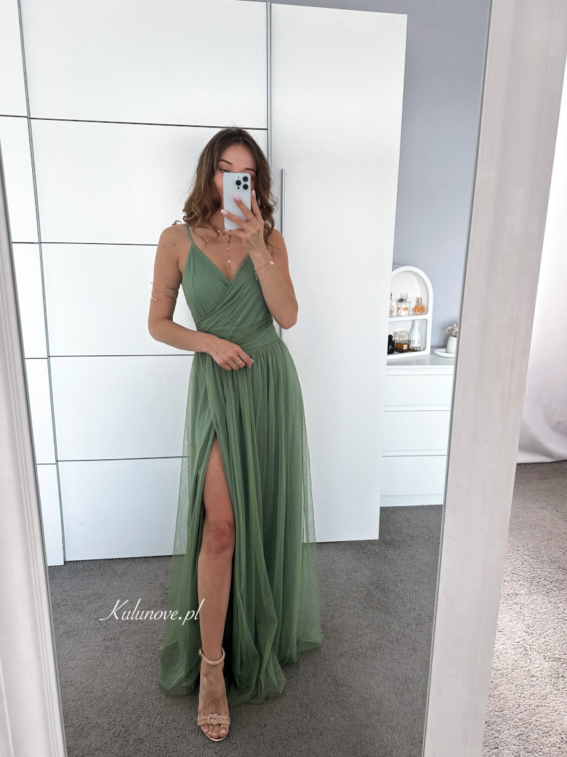 The sage color makes the dress ideal for summer evenings or romantic get-togethers.